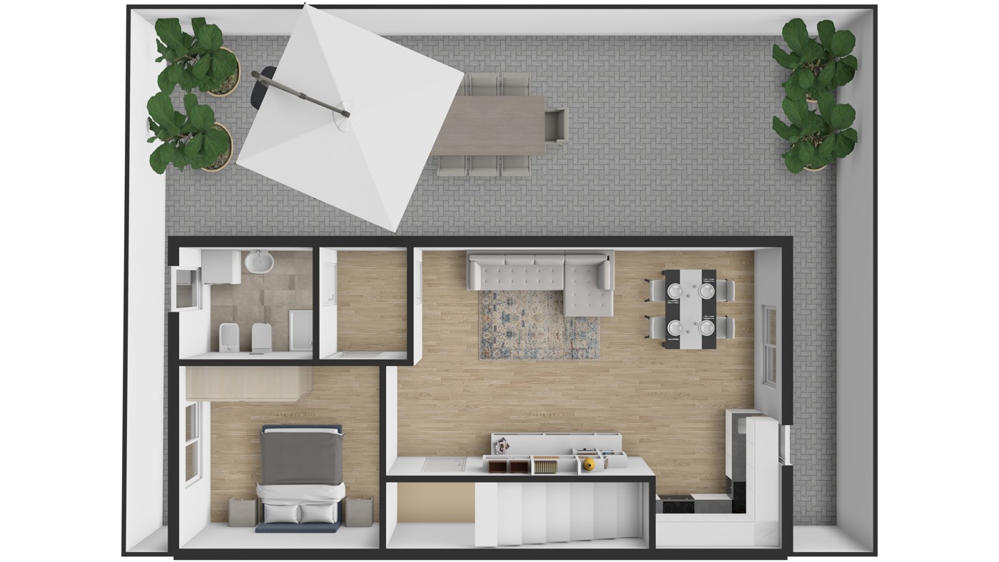 Secondo piano: collegato tramite scala interna, ospita un ulteriore living con accesso alla terrazza, caratterizzata da doppio affaccio estovest, una camera e un bagno finestrato.