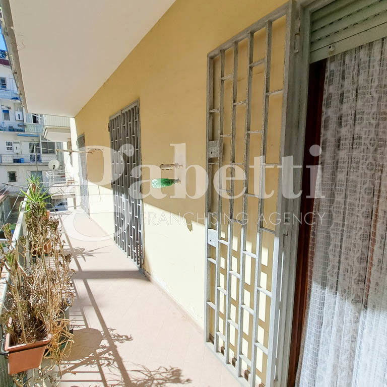 L' unit abitativa in discreto stato ed cos suddivisa: ingresso in ampio disimpegno, salone doppio, due camere da letto, cucina abitabile, bagno e ripostiglio, completa la propriet un ampio balcone accessibile da tre camere.