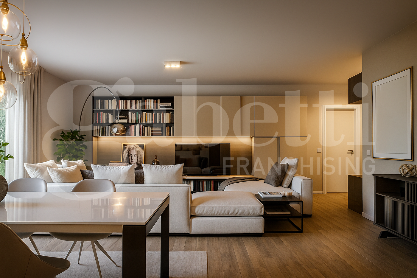 La zona giorno in un unico ambiente di circa 44 metri quadrati si affaccia mediante una grande vetrata apribile sul grande terrazzo esterno.