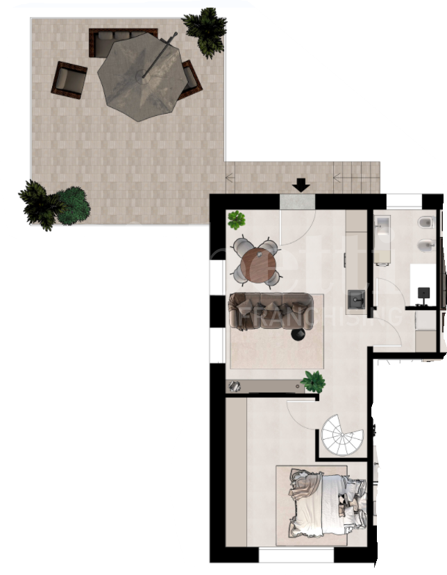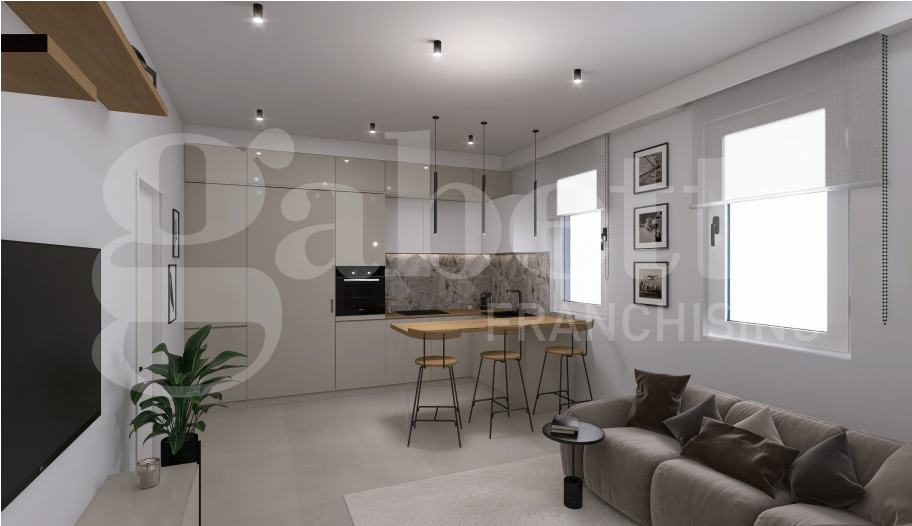 L' unit in questione disposta su due livelli ed cos composta: al piano rialzato troviamo l'ingresso su zona living con parete cottura a vista, una camera matrimoniale di generose dimensioni ed un bagno finestrato, terrazzo di 31mq. Al piano inferiore ampia "taverna" divisibile in 2 camere entrambe con accesso al cortile di propriet di 60mq circa.