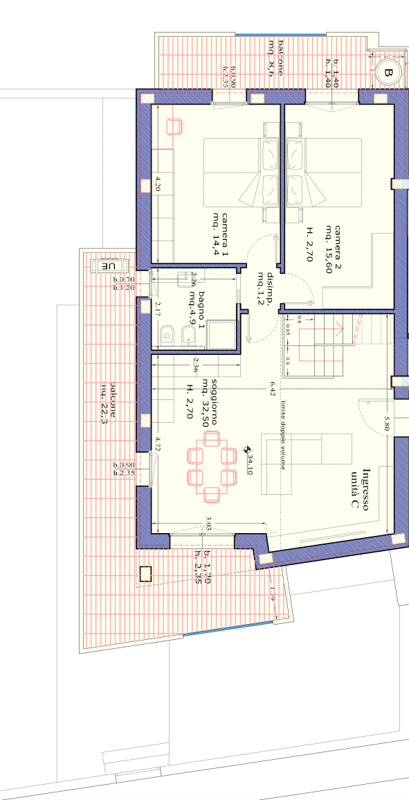 Ingresso in 2, libero su 3 lati e cosi disposto: Al piano primo: - Due balconi abitabili (22 mq e 8 mq) disposti su 3 lati dellappartamento - Living Open space di quasi 33 mq - Scale di accesso alla mansarda - Bagno finestrato con doccia - Camera matrimoniale 1 di circa 15,6 mq - Camera matrimoniale 2 di circa 14,4 mq - Mansarda/Sottotetto di quasi 30 mq con balcone Al piano terra: - Posti auto per circa 40 mq Prezzo al mq commerciale: circa Euro 3.527,00 + IVA Prezzo richiesto: Euro 388.000 + IVA "APPARTAMENTO D": Circa 73 mq calpestabili, circa 100 mq commerciali.