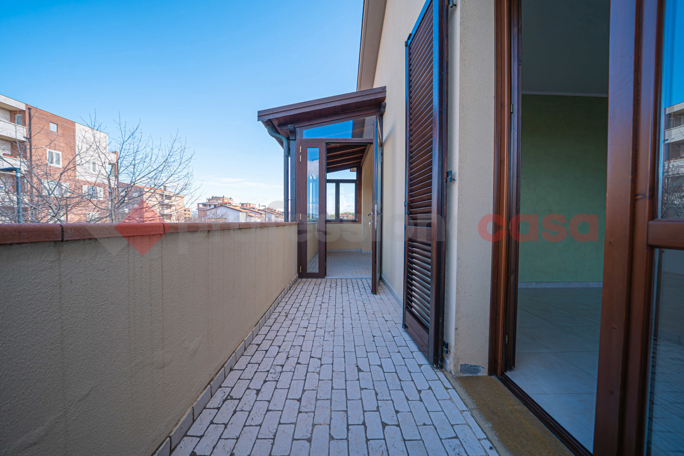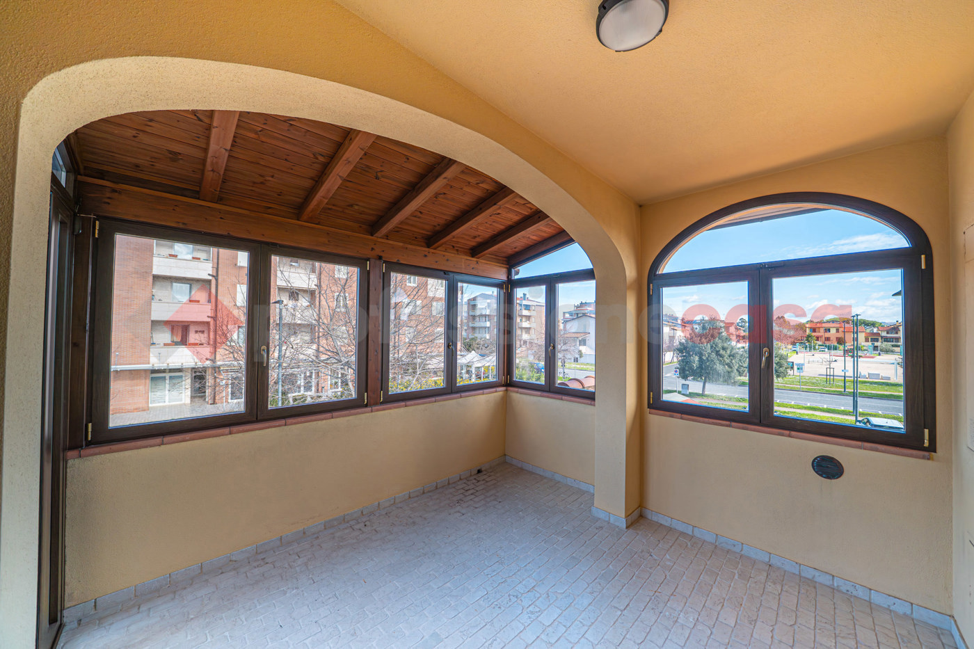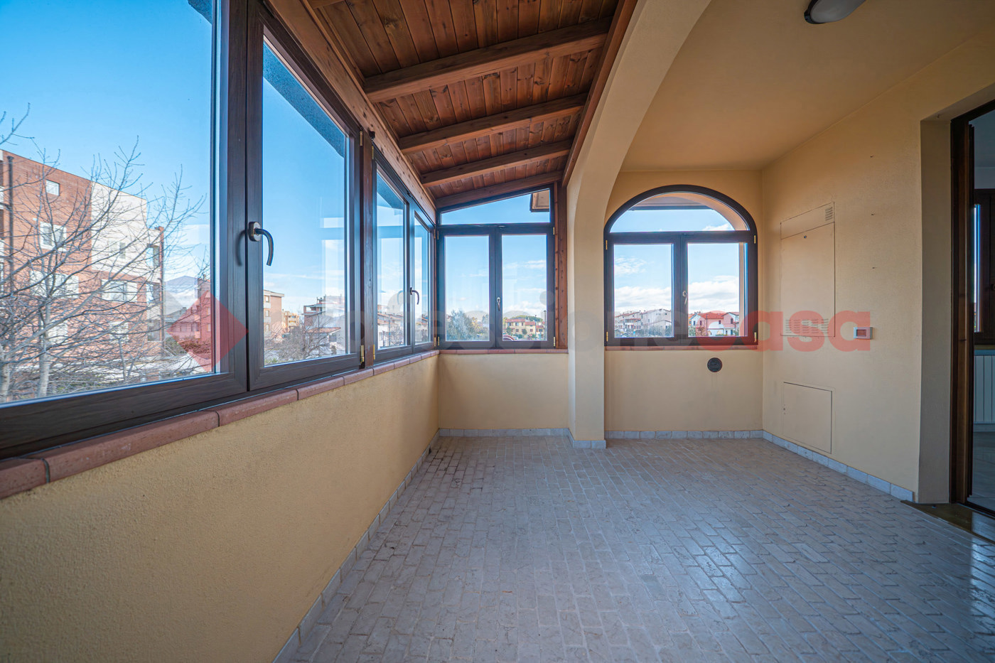 Si accede al piano 1° alto, da vano scale esterno e balcone d'ingresso al soggiorno che si affaccia su un altro balcone e sulla cucina, che a sua volta accede alla stupenda veranda chiusa e coperta che immagazzina luce tutto l'anno; la zona notte, separata da una porta a scomparsa composta da 2 camere da letto, una matrimoniale e l'altra singola, ed un bagno con doccia e lucernario elettrico.