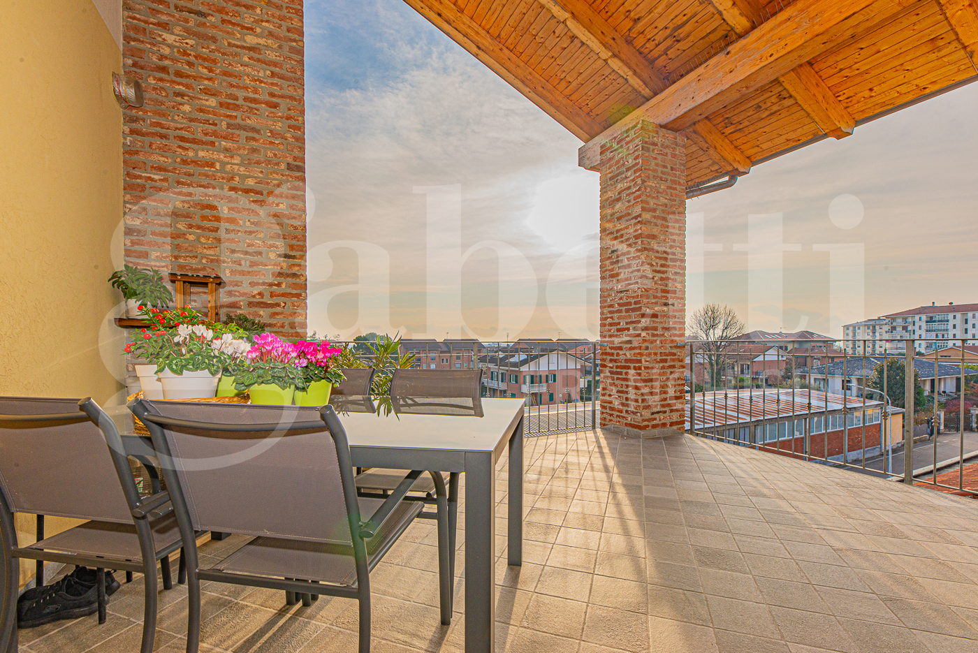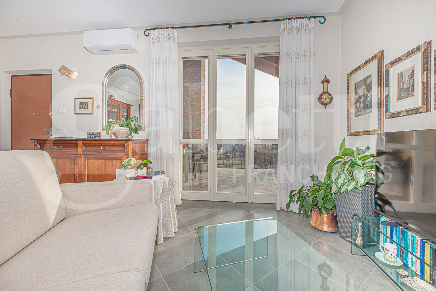 In una piccola palazzina del 2017 di soli 4 alloggi dotata di ascensore, appartamento di circa 120 mq commerciali, occupante tutto l'ultimo piano con posizione privilegiata, libero su quattro lati, dotato di un ampio terrazzo coperto ideale per momenti di relax all'aria aperta, una cucina abitabile con uscita su un terrazzino, un luminoso e spazioso soggiorno, camera matrimoniale, cameretta e due bagni moderni.