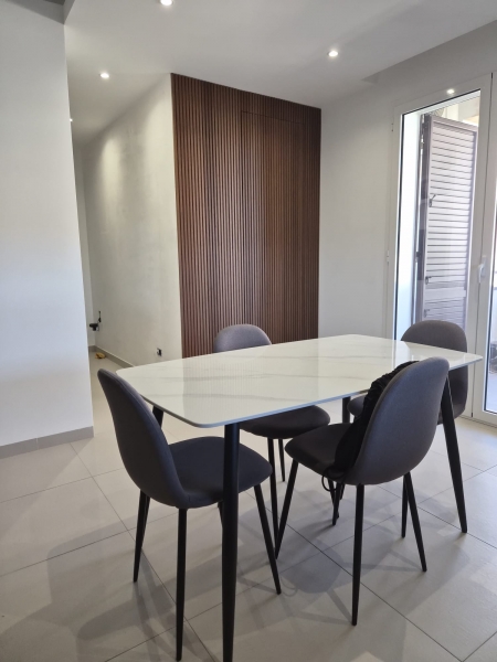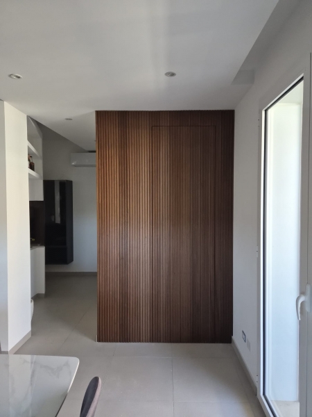 L'appartamento è composto da un ampio salone cucina, lavanderia, bagno, due camere da letto e un ripostiglio.l'immobile è dotato di climatizzatori, impianto fotovoltaico di 8 KW Tutte le porte sono realizzate filo muro, e una parete realizzata con sopra ed elegante boiserie in legno.
