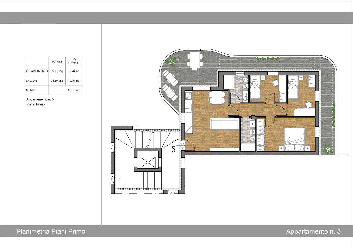 L'ampio balcone perimetrale permette di poter accogliere i propri ospiti per cene all'aperto o da dedicare al proprio relax.