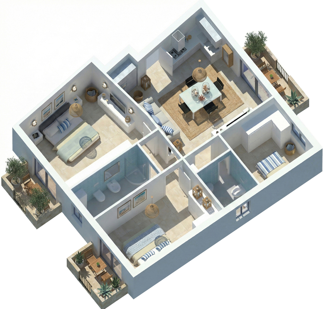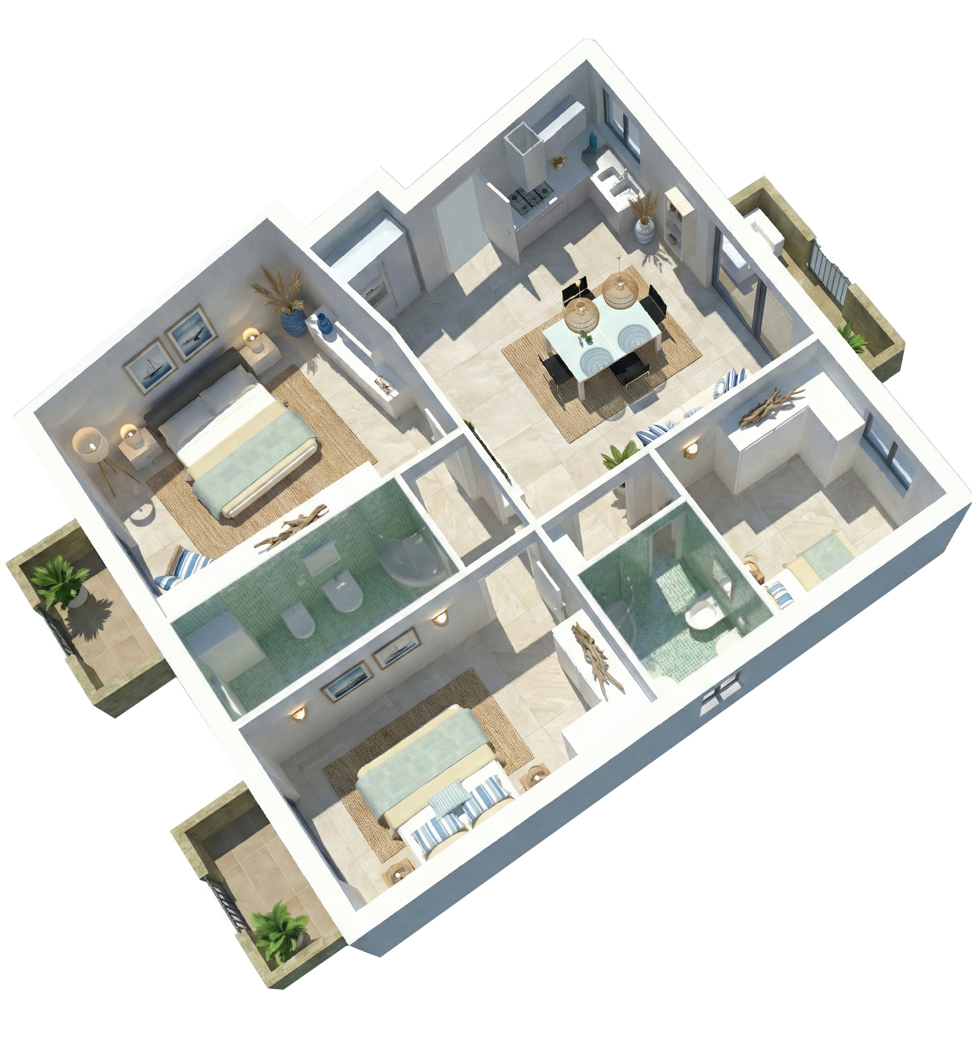 La zona notte include due camere da letto matrimoniali, entrambe con uno spazio esterno dedicato, una cameretta ed infine due bagni moderni entrambi con finestra.