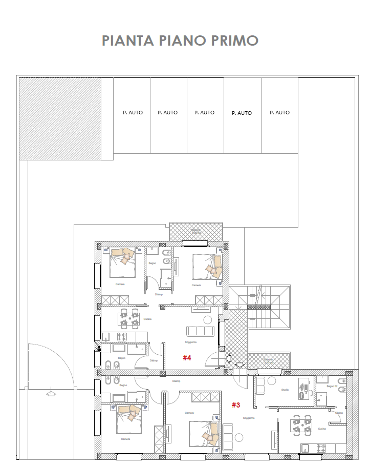 Appartamento N°3 di 95mq 156.000,00. Quattro locali posto al piano primo composto da ingresso, soggiorno, cucina abitabile, camera matrimoniale, cameretta, studio, doppi servizi e balcone.