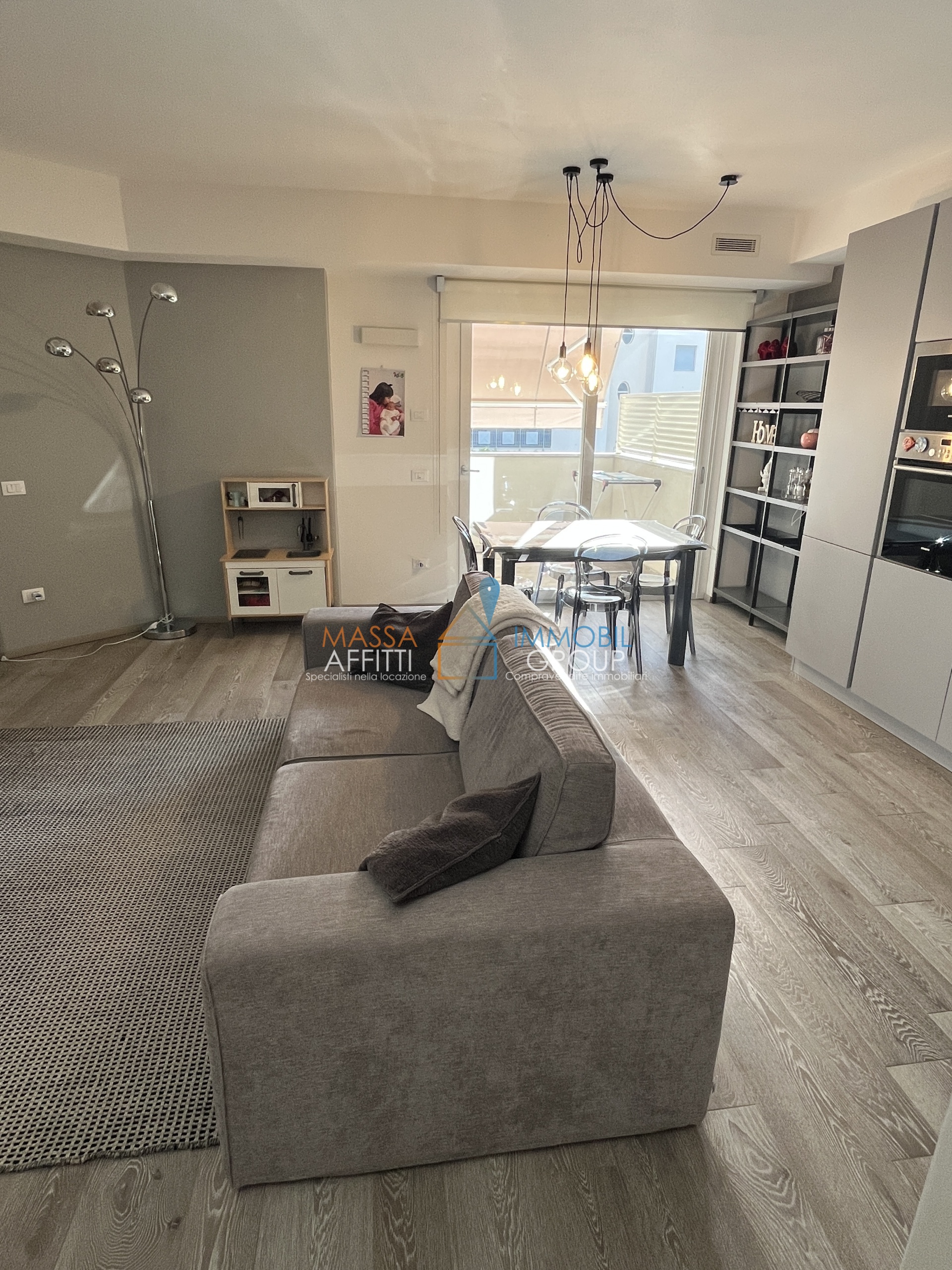 ImmobilGroup Rif 3575 Appartamento al primo piano, nelle vicinanze del centro di Massa, in condominio di nuova costruzione, con posto auto assegnato coperto e cantina, composto da: Ingresso su zona giorno con angolo cottura e balcone, Camera matrimoniale e Camera singola, entrambe con accesso al balcone, Due bagni con doccia e ripostiglio.