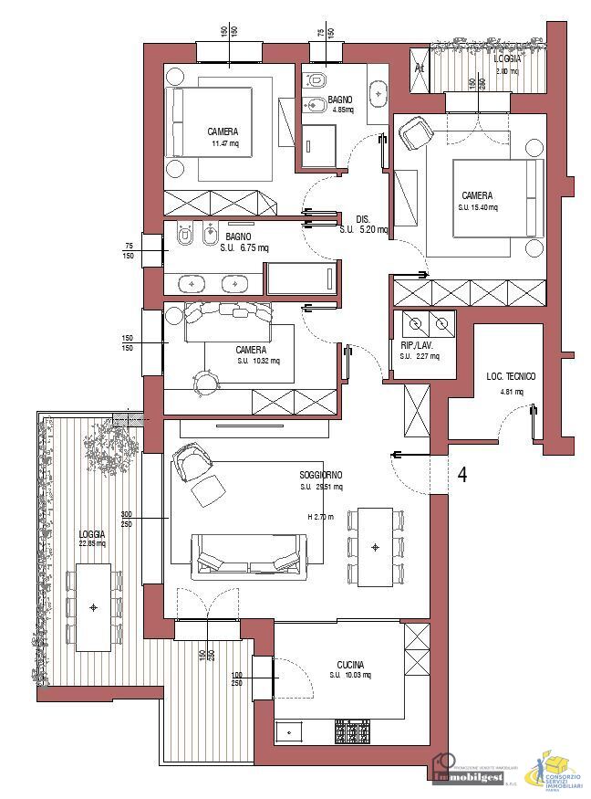 Esempio piano terzo: Mq 130 composto da ampio soggiorno con loggia di 23 mq, cucina abitabile, tre camere di cui due matrimoniali, due bagni finestrate, ripostiglio, cantina.