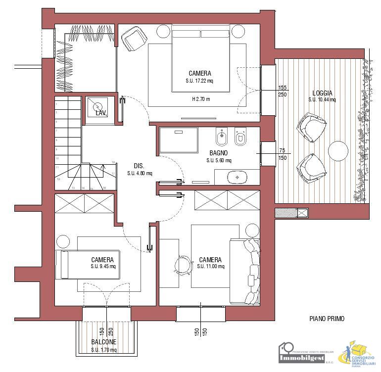 Piano primo con tre camere (due matrimoniali e una singola) con loggia di 10 mq, bagno con finestra, lavanderia e cantina.