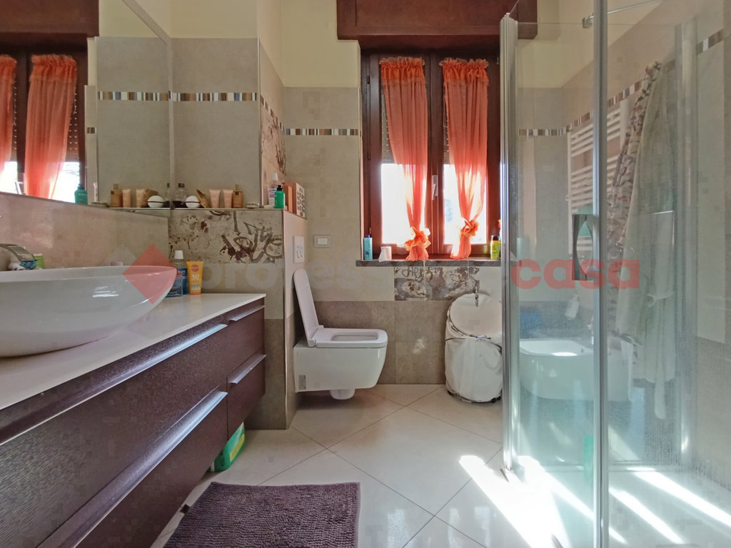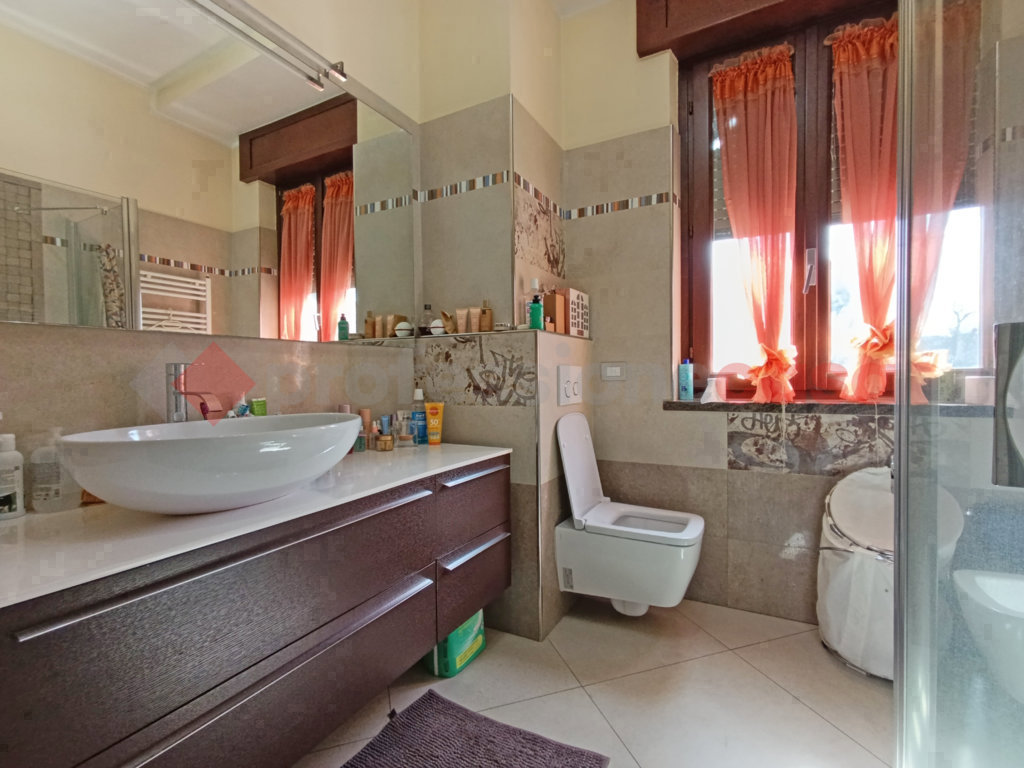 L'immobile si compone di soggiorno con uscita sul balcone, cucina abitabile con porte scorrevoli e balconcino di servizio, bagno principale, camera matrimoniale con bagno privato e ripostiglio a piano primo; Al piano terra, con ingresso diretto dal vano scala condominiale e scala interna che lo collega con il piano superiore, troviamo due stanze, un bagno/lavanderia ed un ripostiglio/cantina, oltre ad un ampio box auto singolo.