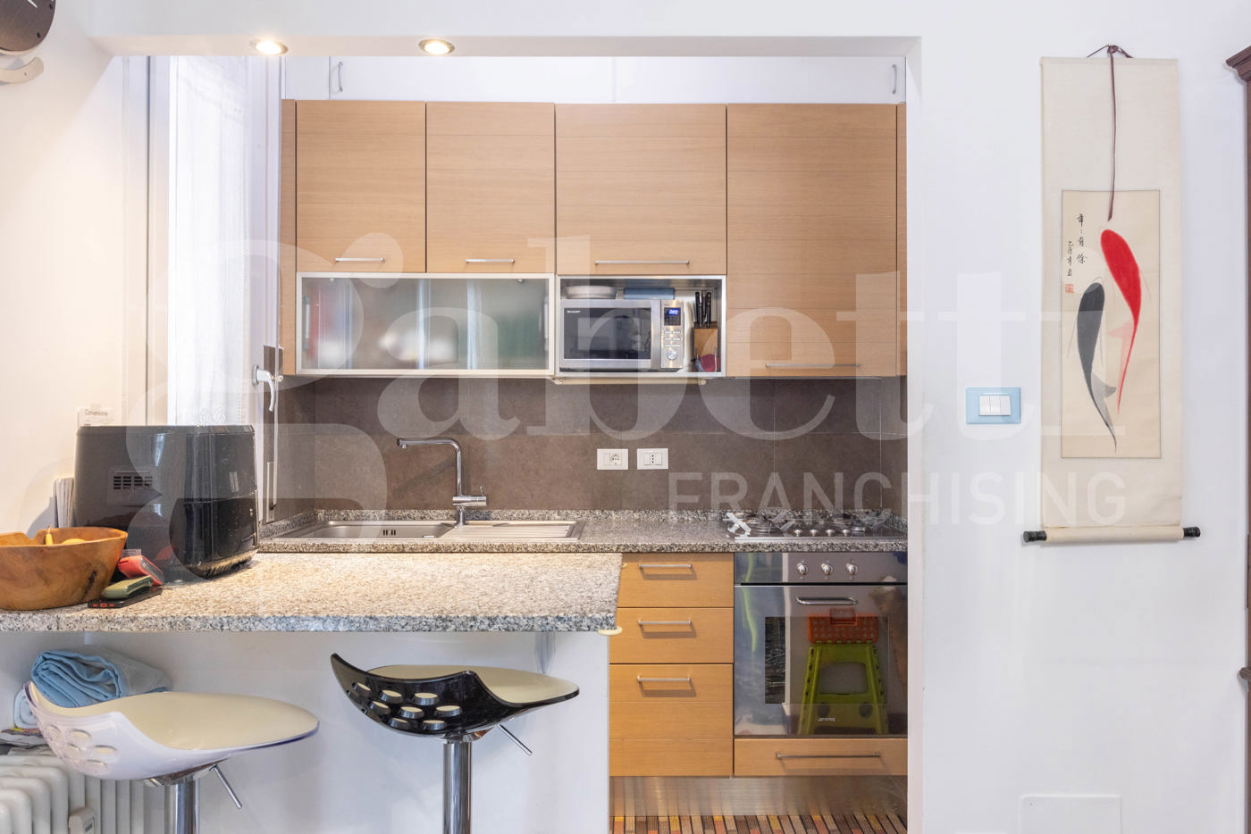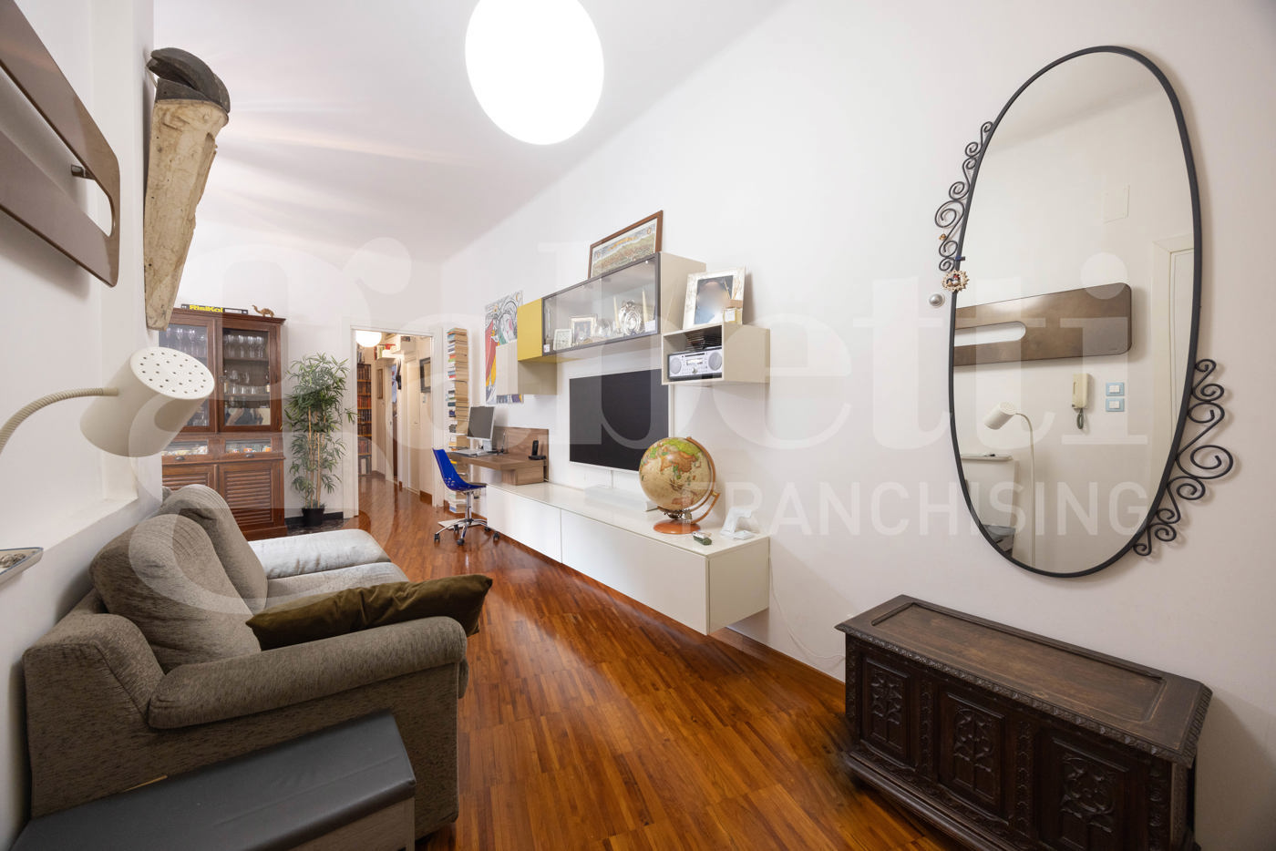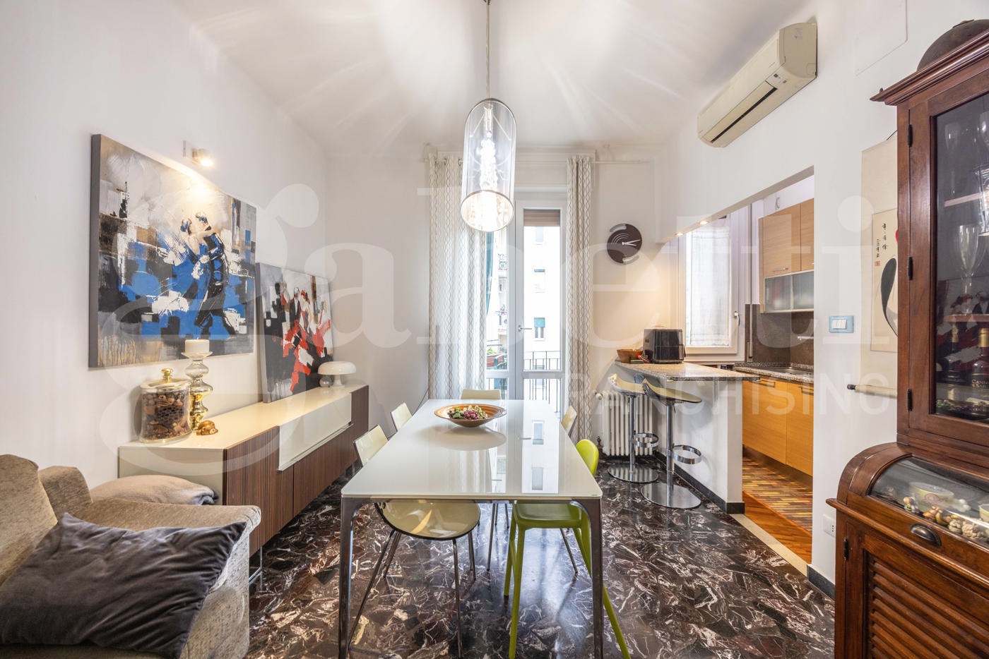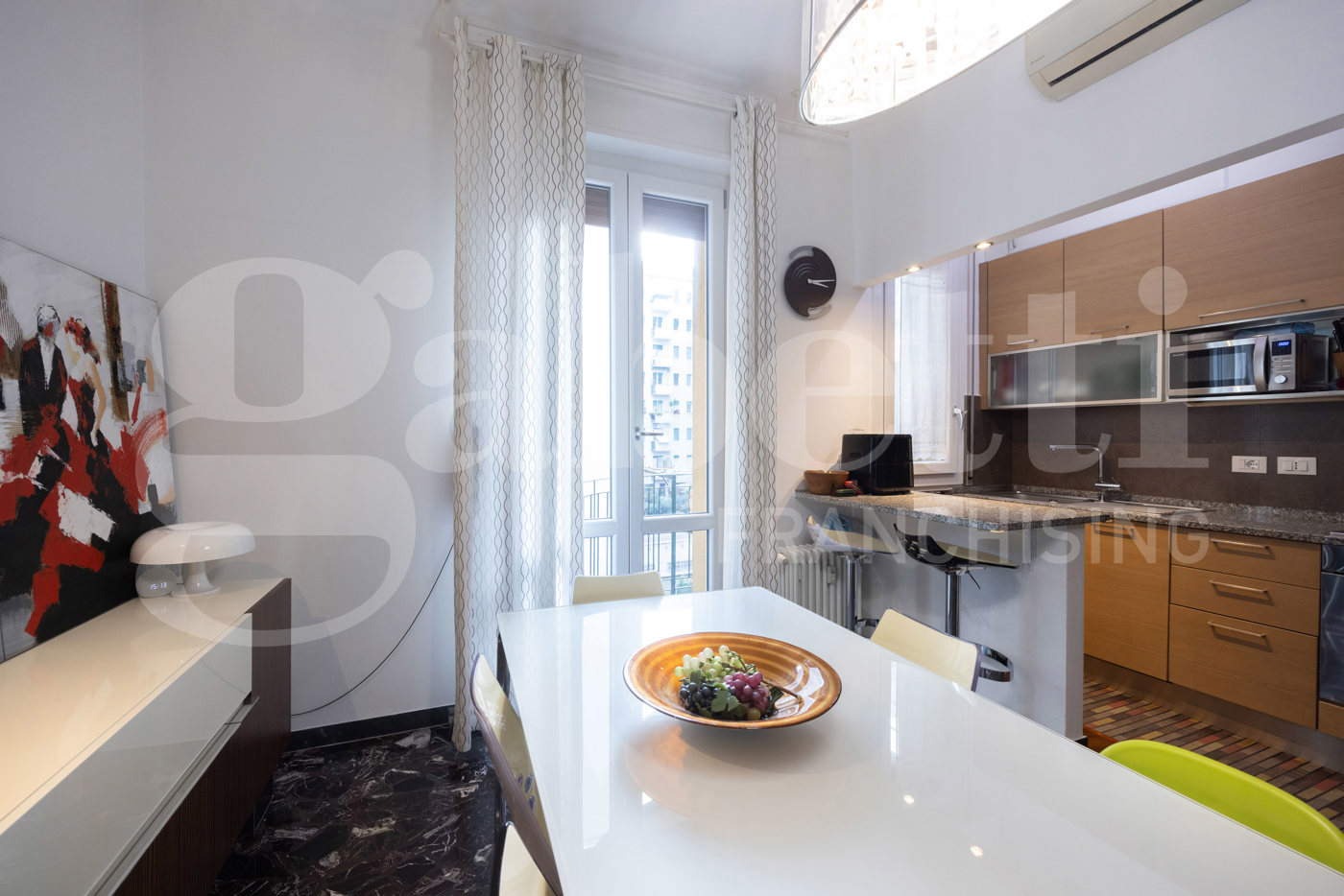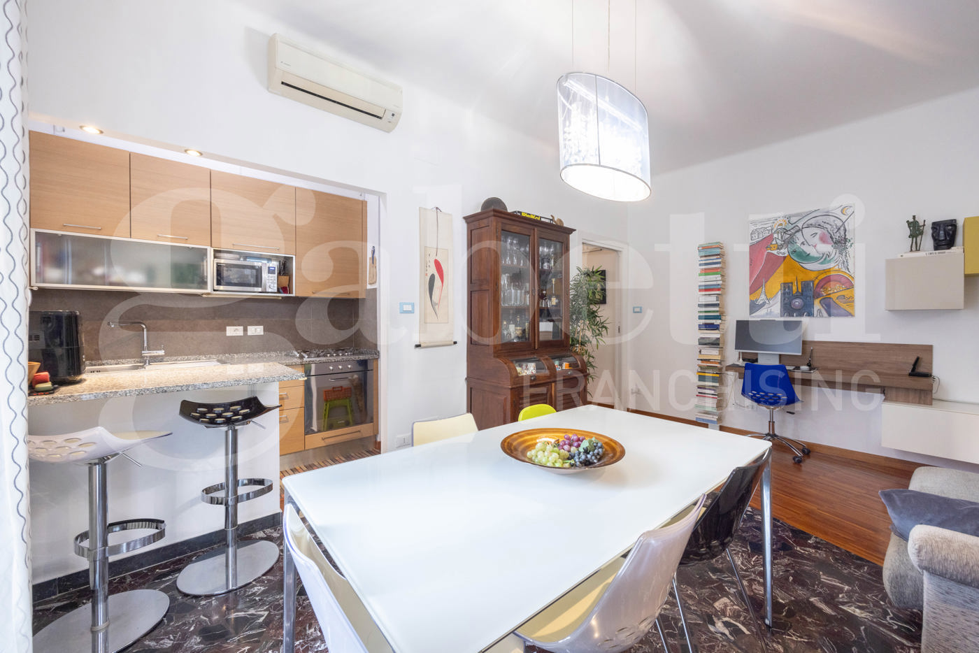 L'unit immobiliare si distingue per una razionale divisione tra zona giorno e notte ed composta da: Ingresso diretto su un ampio e luminoso soggiorno con accesso al balcone e cucinotto a vista.