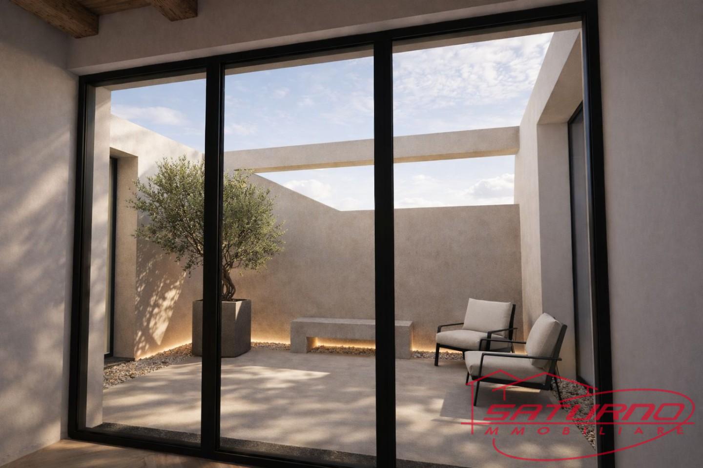 L'appartamento, con accesso indipendente si compone da soggiorno con angolo cottura, ripostiglio, due camere matrimoniali, camera doppia, due bagni e chiostra interna parzialmente coperta di 20 mq. Attraverso scala interna si accede al piano seminterrato dove si trova un unico ampio vano di 42 mq. con altezza di 2.20 m. da poter adibire a comoda taverna.