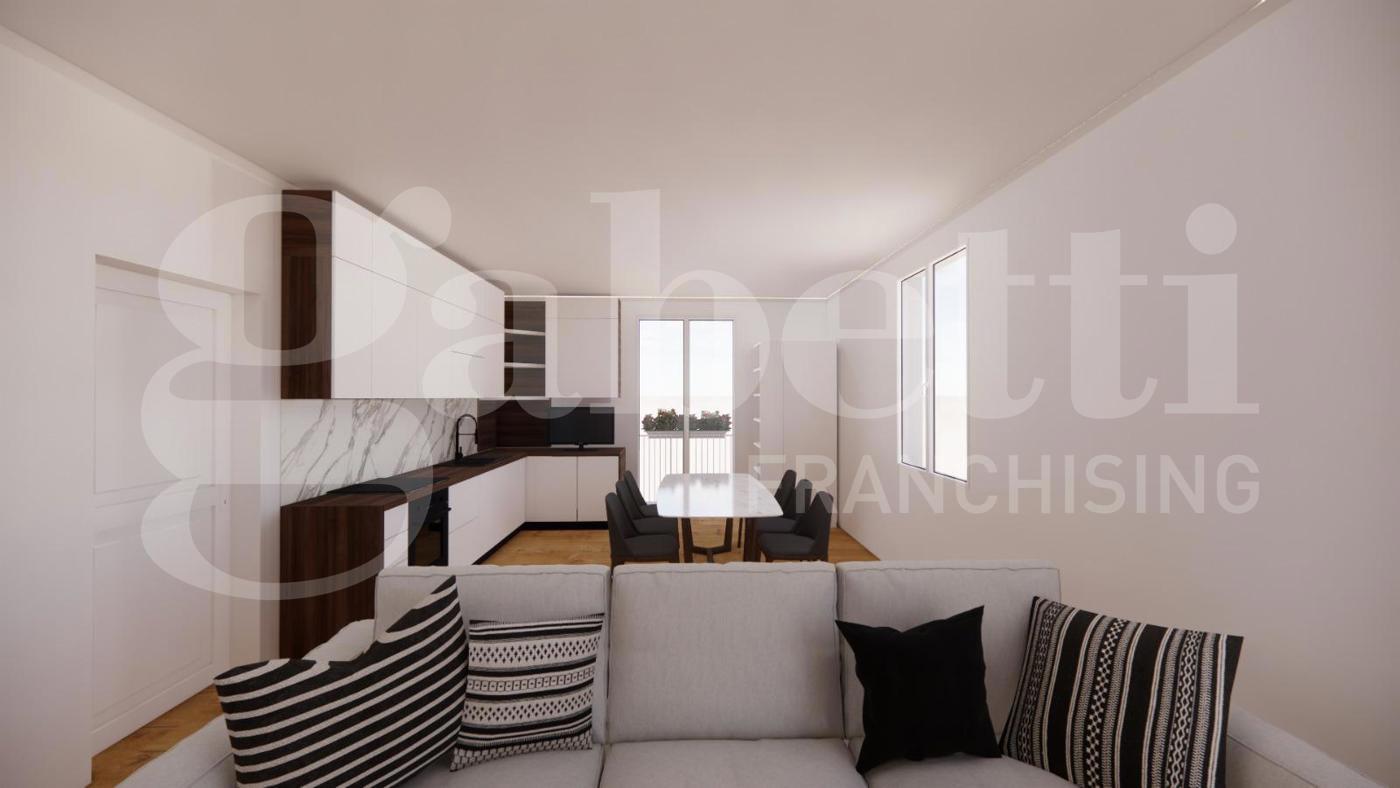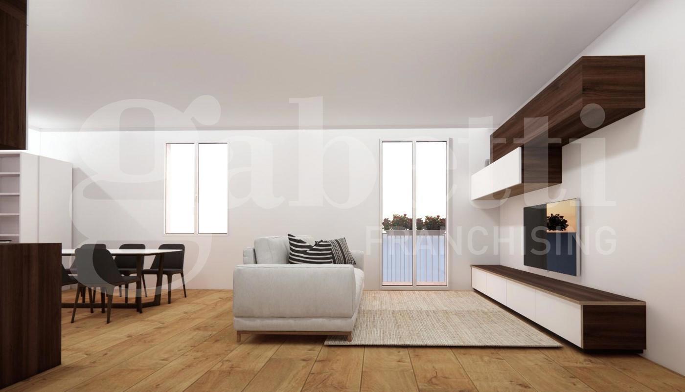 E' composto da ingresso, soggiorno con cucina a vista in ambiente open space ed uscita su due balconi, disimpegno notte con bagno cieco, lavanderia, ampio bagno finestrato e due generose camere matrimoniali.