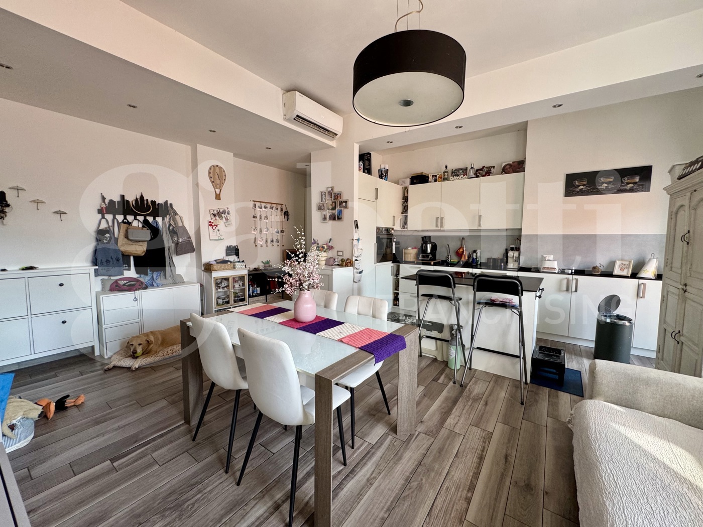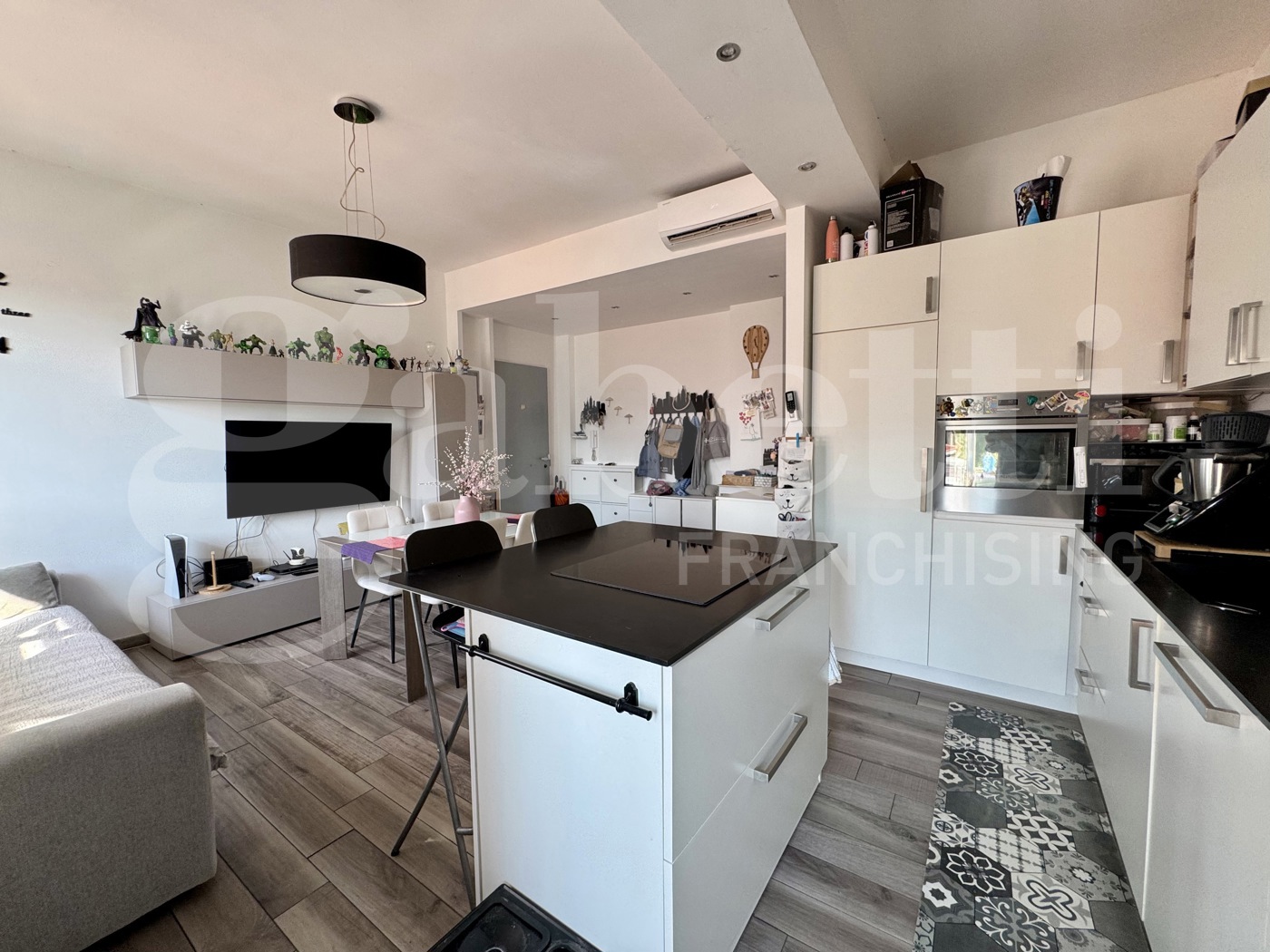 Limmobile cos disposto: - Ingresso in sala con cucina a vista - Veranda - Corridoio sfruttabile che accompagna alla zona notte - 2 Camere (di cui una dotata di cabina armadio) con accesso alla Balconata - Bagno - COMPLETA LA PROPRIET UNA COMODA, AMPIA E ASCIUTTA CANTINA Come dicevamo le spese di amministrazione sono irrisorie, 45/mese, e il riscaldamento/raffrescamento tramite inverter.