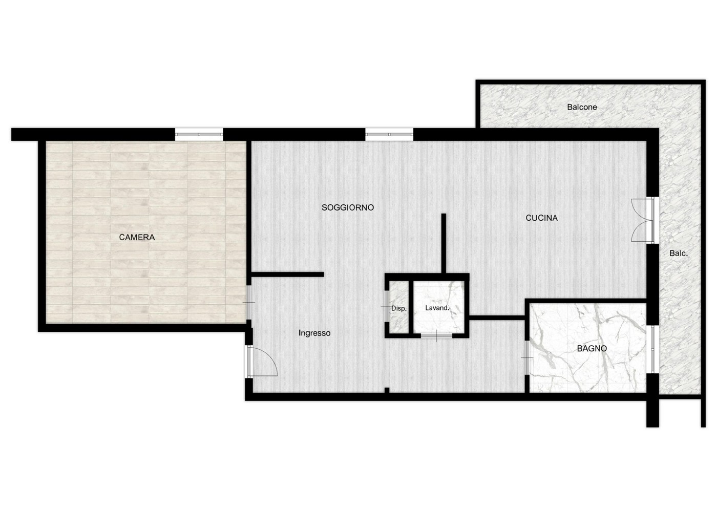 L'immobile composto da: ingresso, soggiorno con cucina abitabile a vista da cui si accede al balcone ad angolo, camera da letto matrimoniale, ripostiglio, lavanderia, bagno finestrato.
