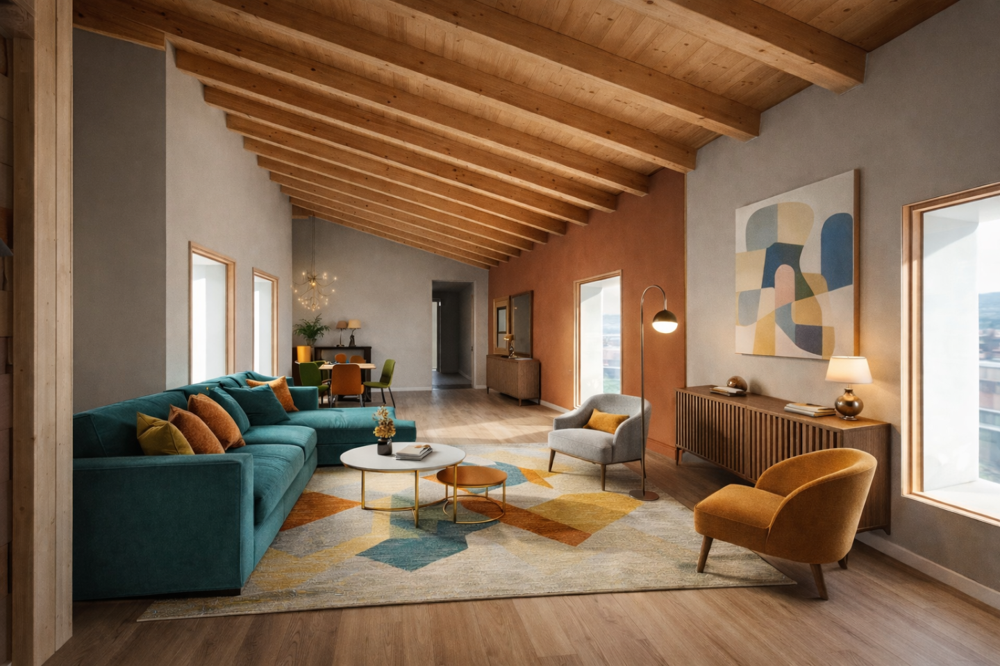 Le ampie finestre e i soffitti alti in legno creano spazi luminosi e accoglienti, mentre il riscaldamento a pavimento garantisce comfort in ogni stagione.