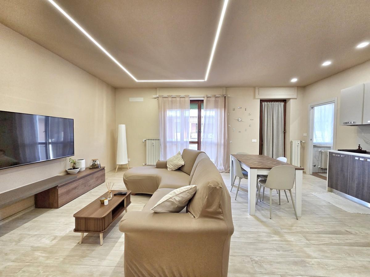 L'ingresso tradizionale cela in maniera sapiente, svelandolo solo a chi viene accolto in casa, l'ampio soggiorno che si fonde con eleganza alla funzionale cucina a vista, spaziosissimo ambiente prospiciente il luminoso balcone e il comodo bagno, completo di doccia e finestra; il disimpegno notte, arricchito da un pratico ripostiglio e da una funzionale armadiatura a muro, conduce alle due camere da letto di cui una servita da balcone e al secondo bagno finestrato con doccia.