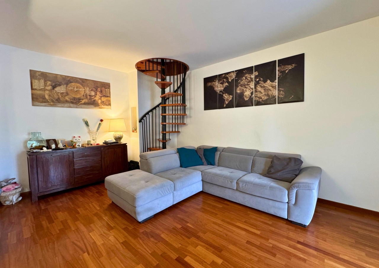 Il living si apre direttamente sulla graziosa verandina con tende da sole e vano tecnico ben celato, da sfruttare ad esempio per un aperitivo al tramonto nelle belle sere d'estate.