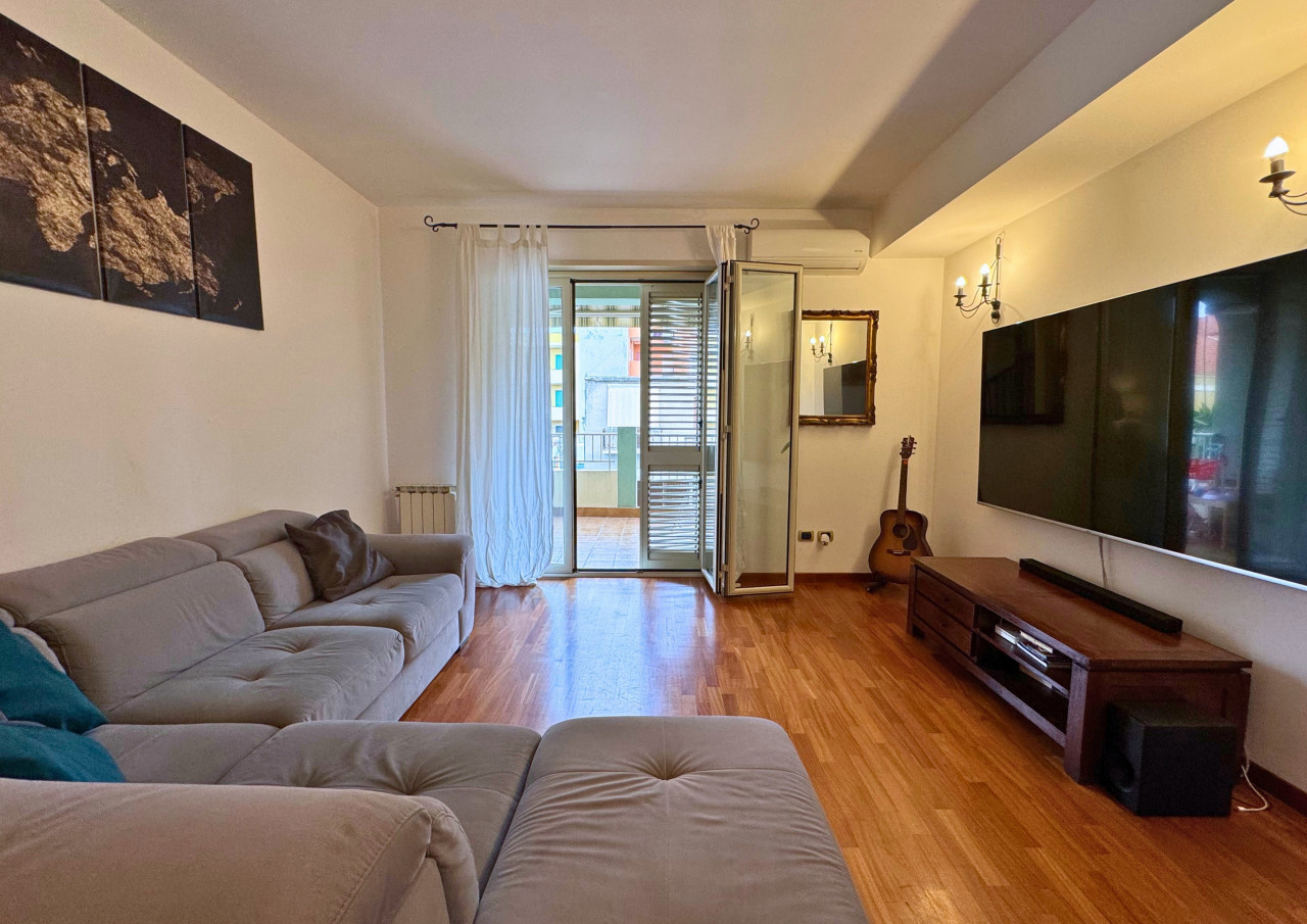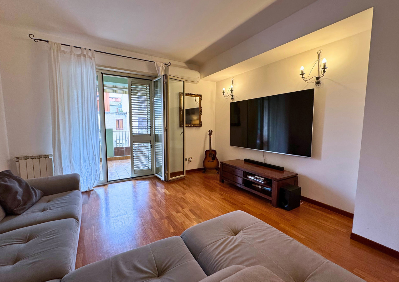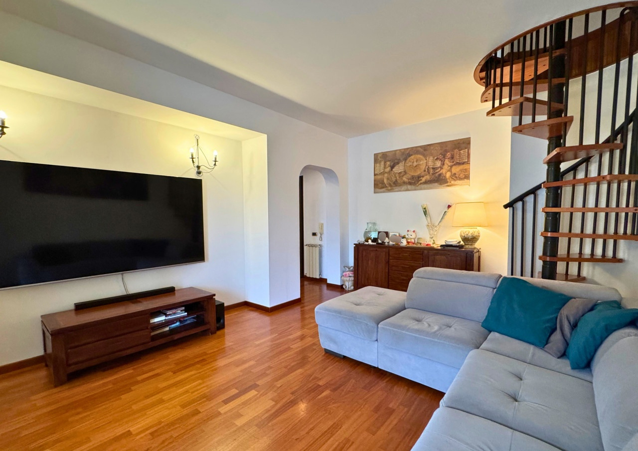 Ad accoglierci l'ingresso che disimpegna la zona giorno dalla zona notte; Da qui un arco in muratura ci introduce nell' ampio e luminoso soggiorno, reso ancora piu' accogliente dal pregiato parquet che e' un filo conduttore di tutto l' appartamento.