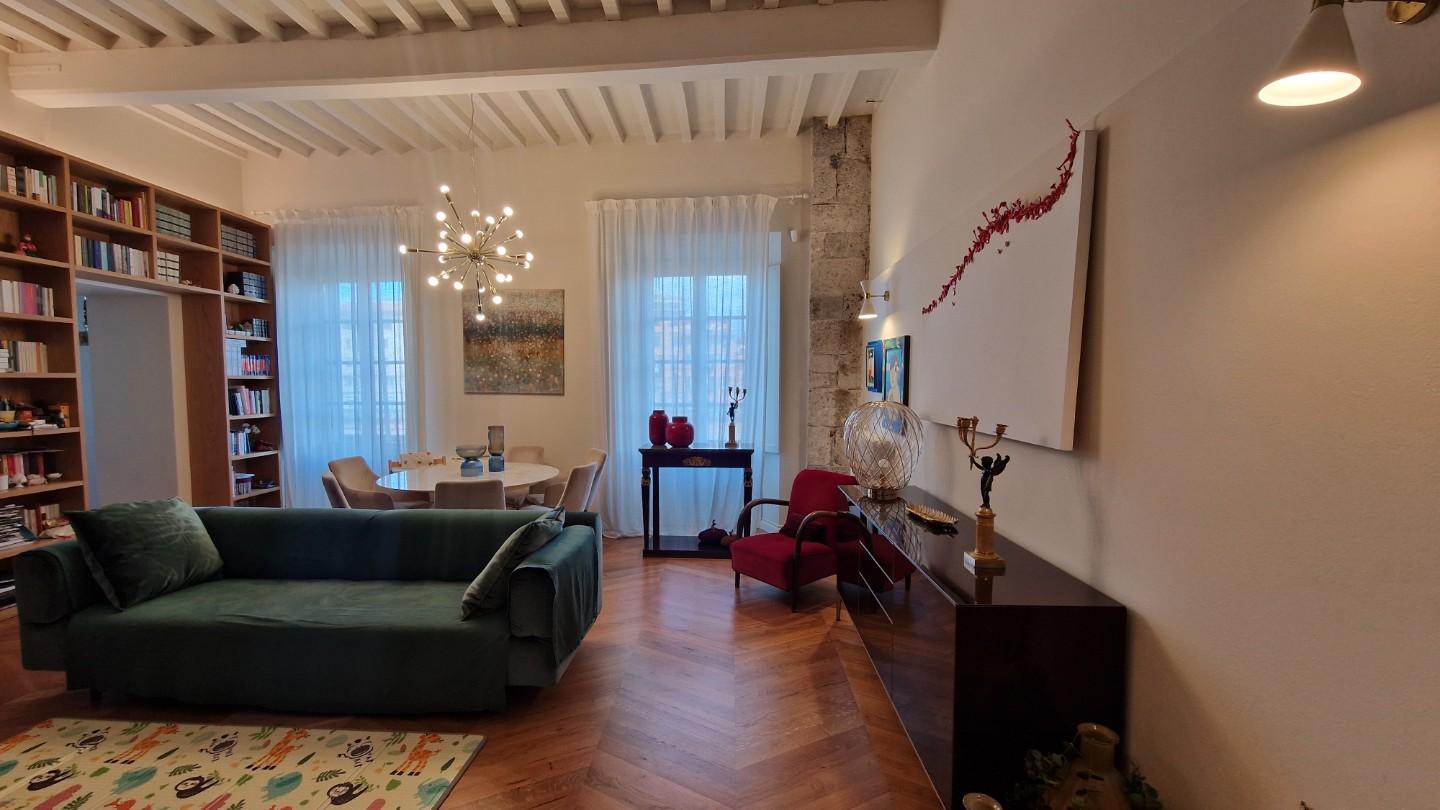 L'immobile si trova al primo piano con ascensore e si compone da ingresso in ampia sala di circa 40 mq con soffitti alti, travi e mezzane, balcone con affaccio diretto sul fiume, cucina abitabile, disimpegno, due camere di cui la matrimoniale con bellissimi affreschi e doppi servizi, oltre a zona lavanderia, guardaroba e ripostiglio, completa la proprietà un ampio garage di circa 26 mq, posto all'interno dell'area condominiale, chiusa con cancello motorizzato.