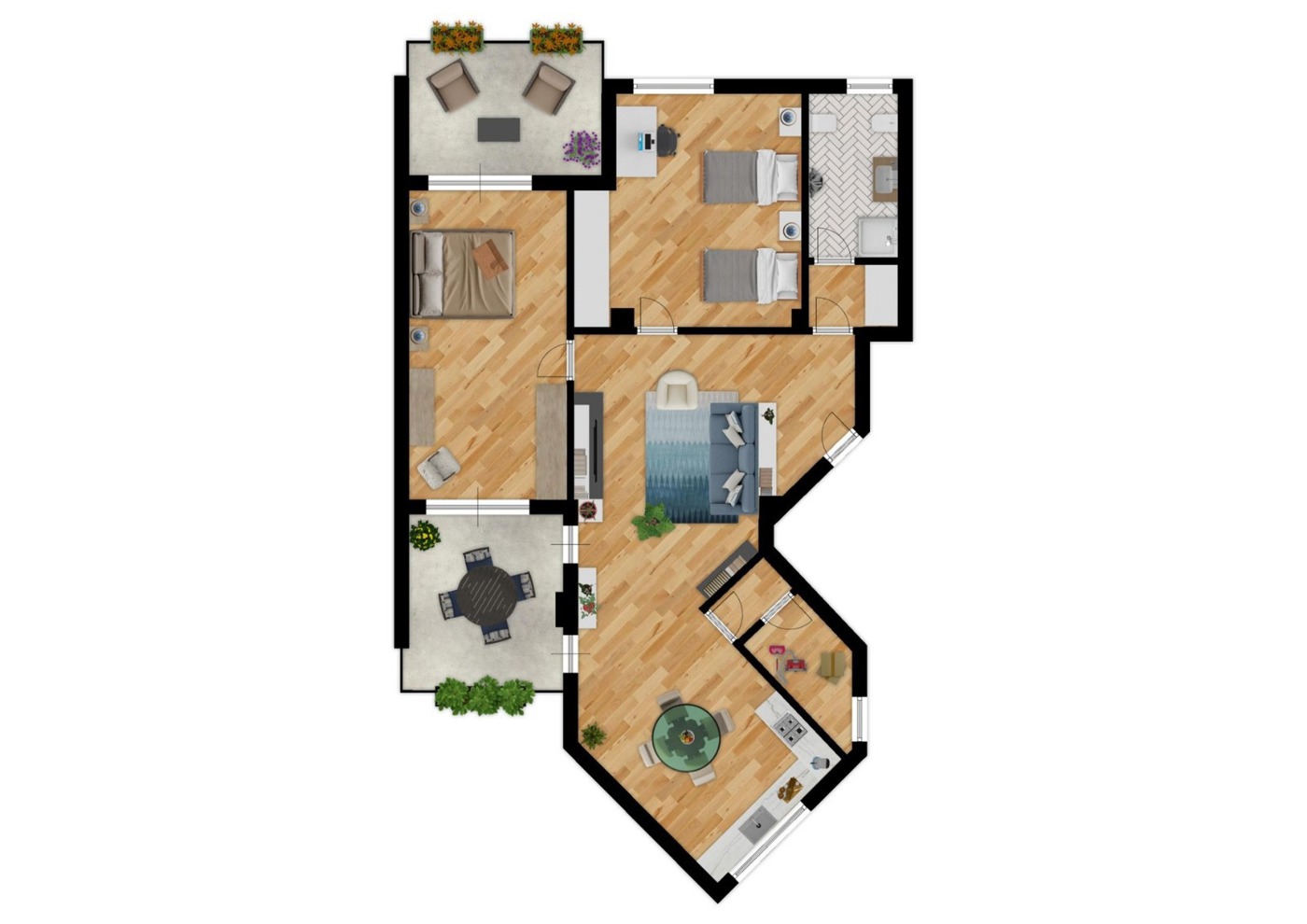 La zona notte composta da due camere da letto, un bagno e un wc di servizio, entrambi finestrati.