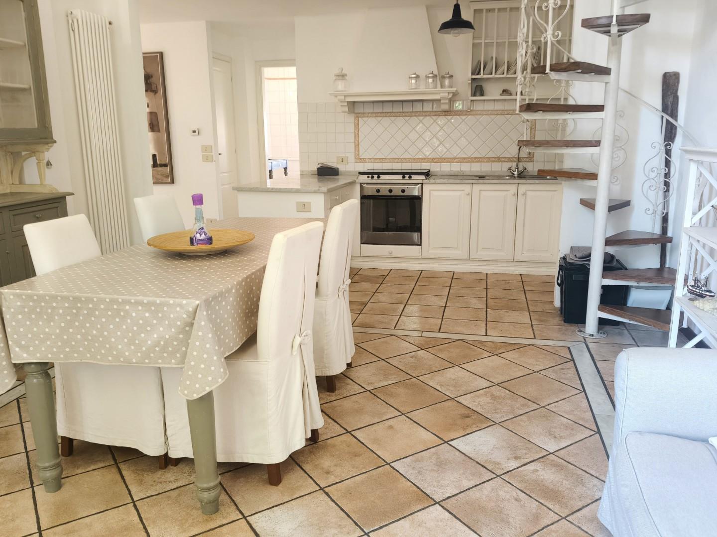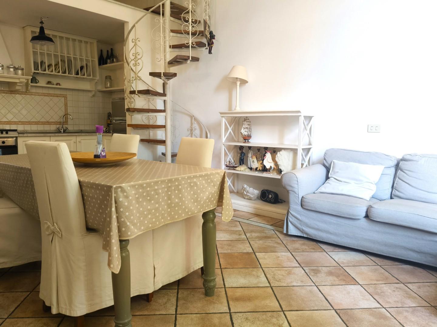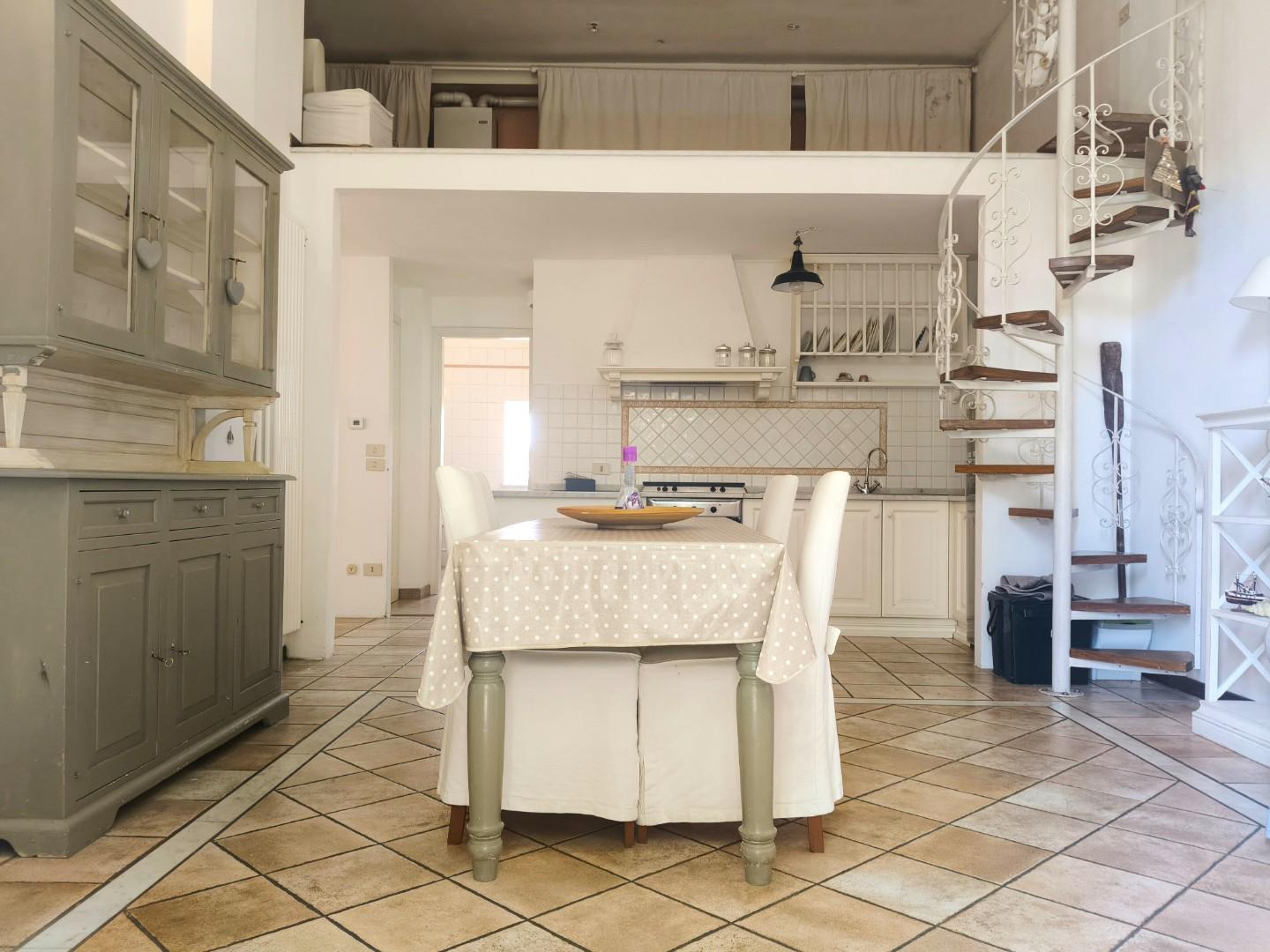Una scala a chiocciola conduce al soppalco, affacciato sulla zona giorno, che offre uno spazio aggiuntivo versatile e ben sfruttabile.