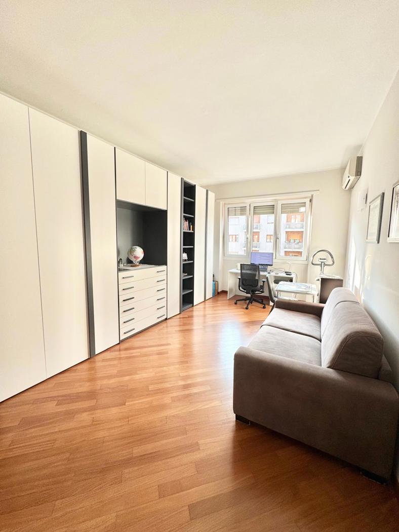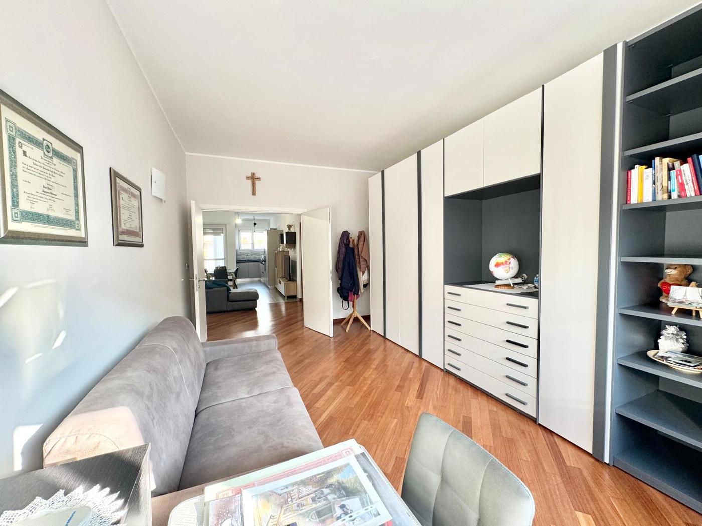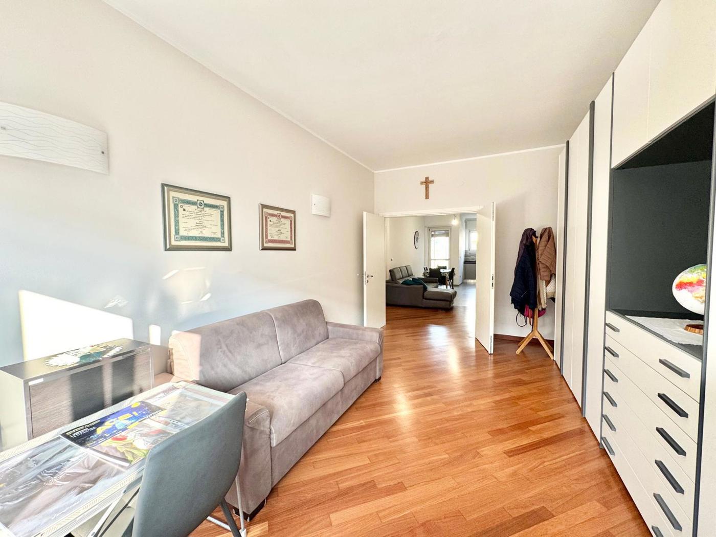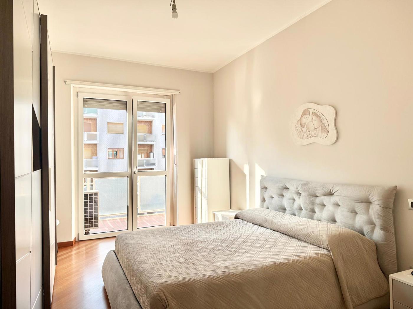 In condominio signorile proponiamo appartamento al piano alto, completamente ristrutturato di recente, composto da: ingresso su soggiorno con cucina a vista, due grandi camere da letto matrimoniali, bagno e ripostiglio.