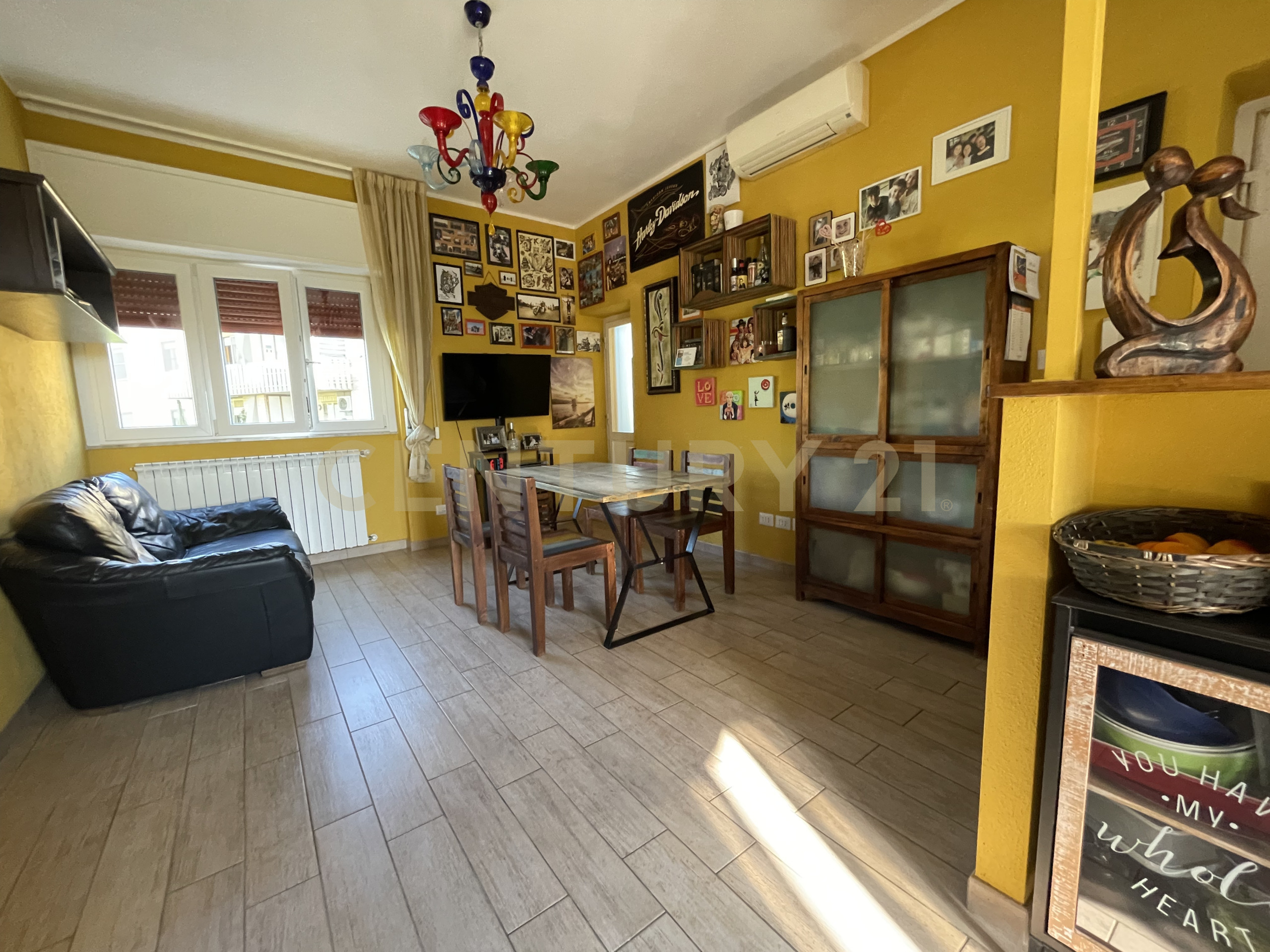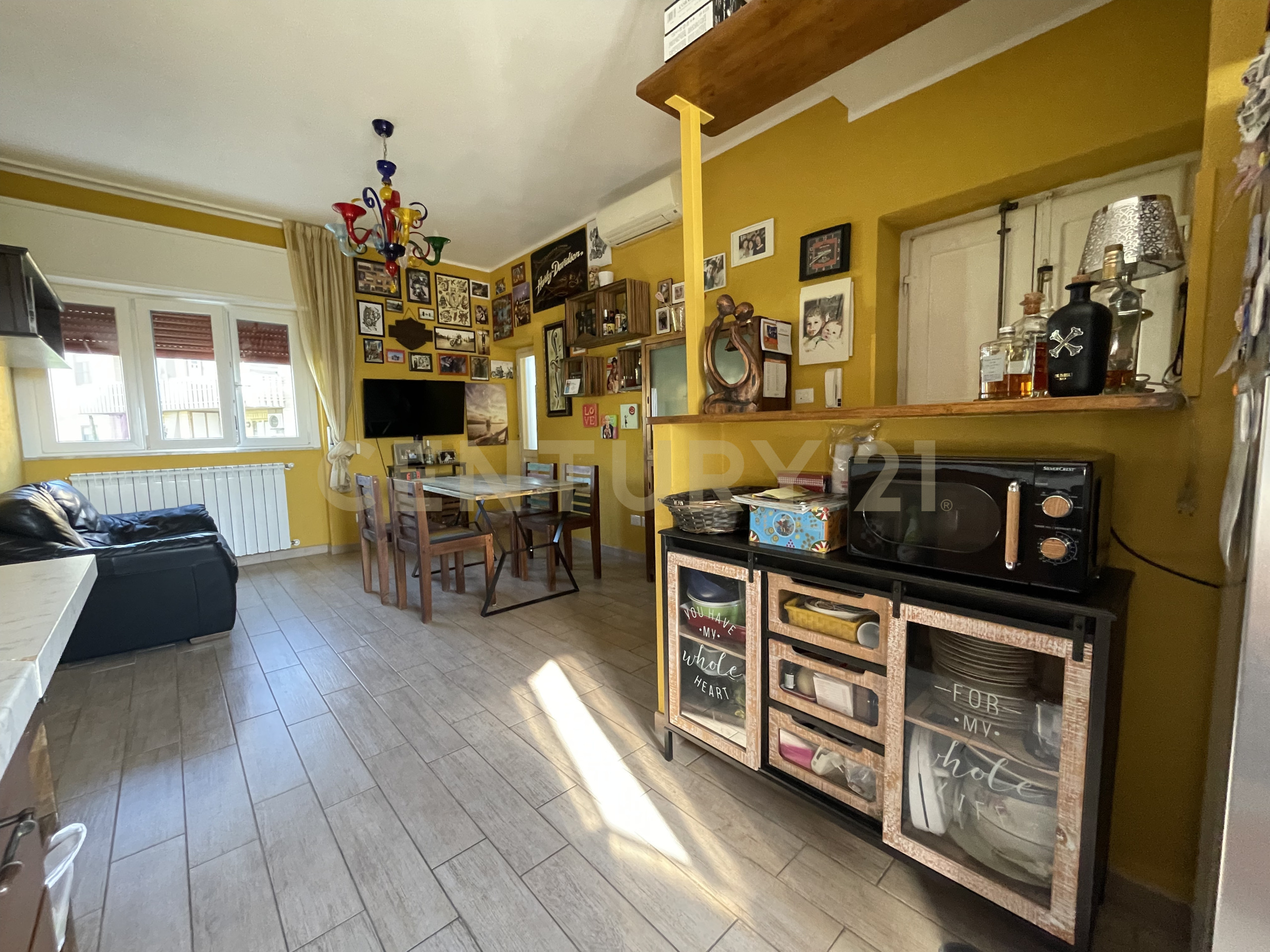 Lingresso si apre su un ampio living open space che unisce soggiorno e cucina in un ambiente moderno e luminoso, valorizzato dalla doppia esposizione.