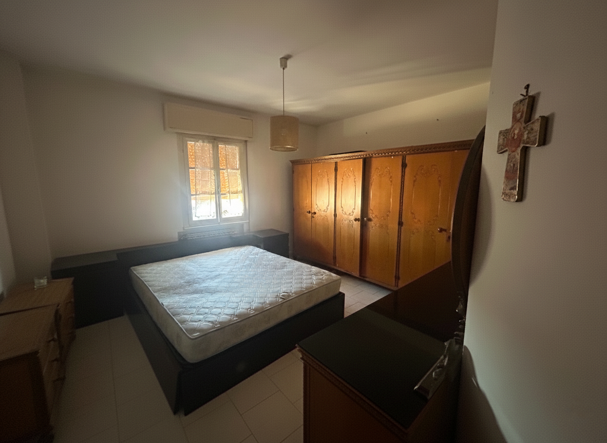 La zona notte comprende una spaziosa camera da letto matrimoniale, un ripostiglio e un bagno.