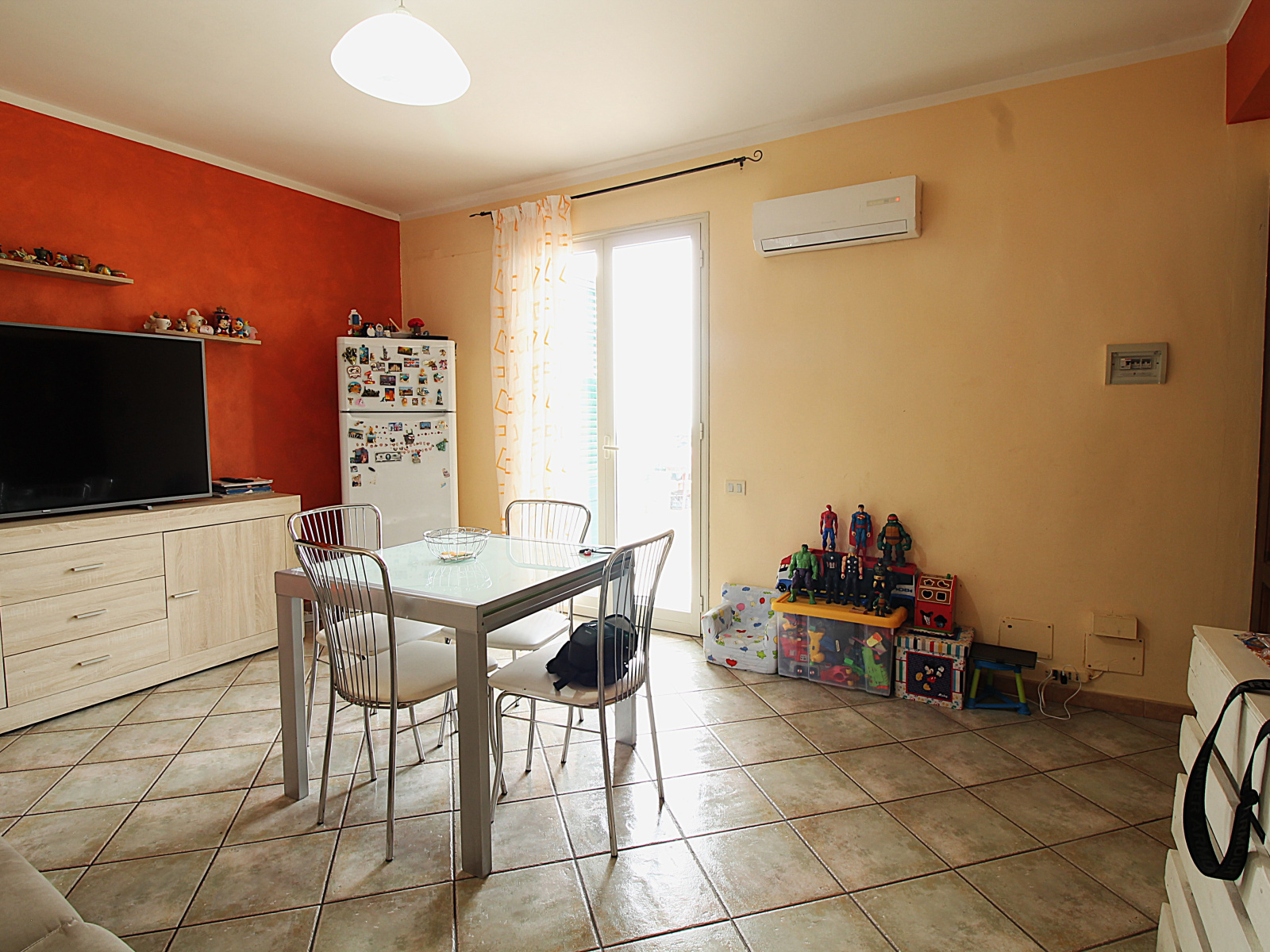 Gli spazi interni sono ben distribuiti, comprendendo un ingresso accogliente, una cucina soggiorno luminosa, una camera matrimoniale con bagno privato, un saloncino che può essere utilizzato come seconda camera, una cameretta e un pratico ripostiglio.\nLe buone condizioni abitative sono evidenziate dagli infissi in alluminio con vetro camera e dalle persiane esterne in alluminio, che garantiscono comfort e isolamento.