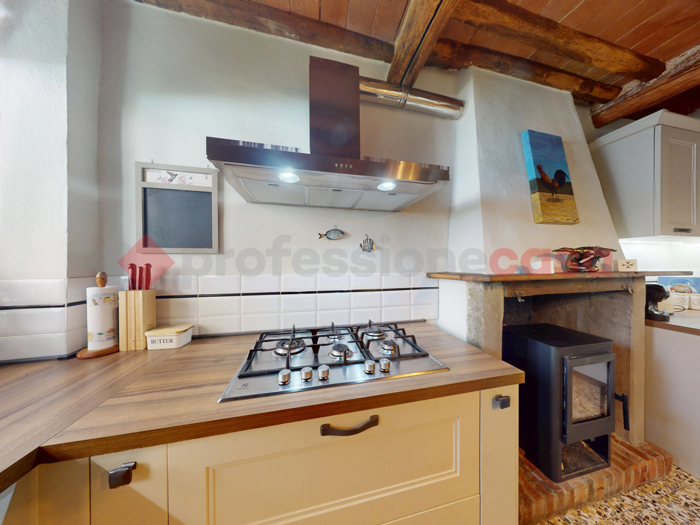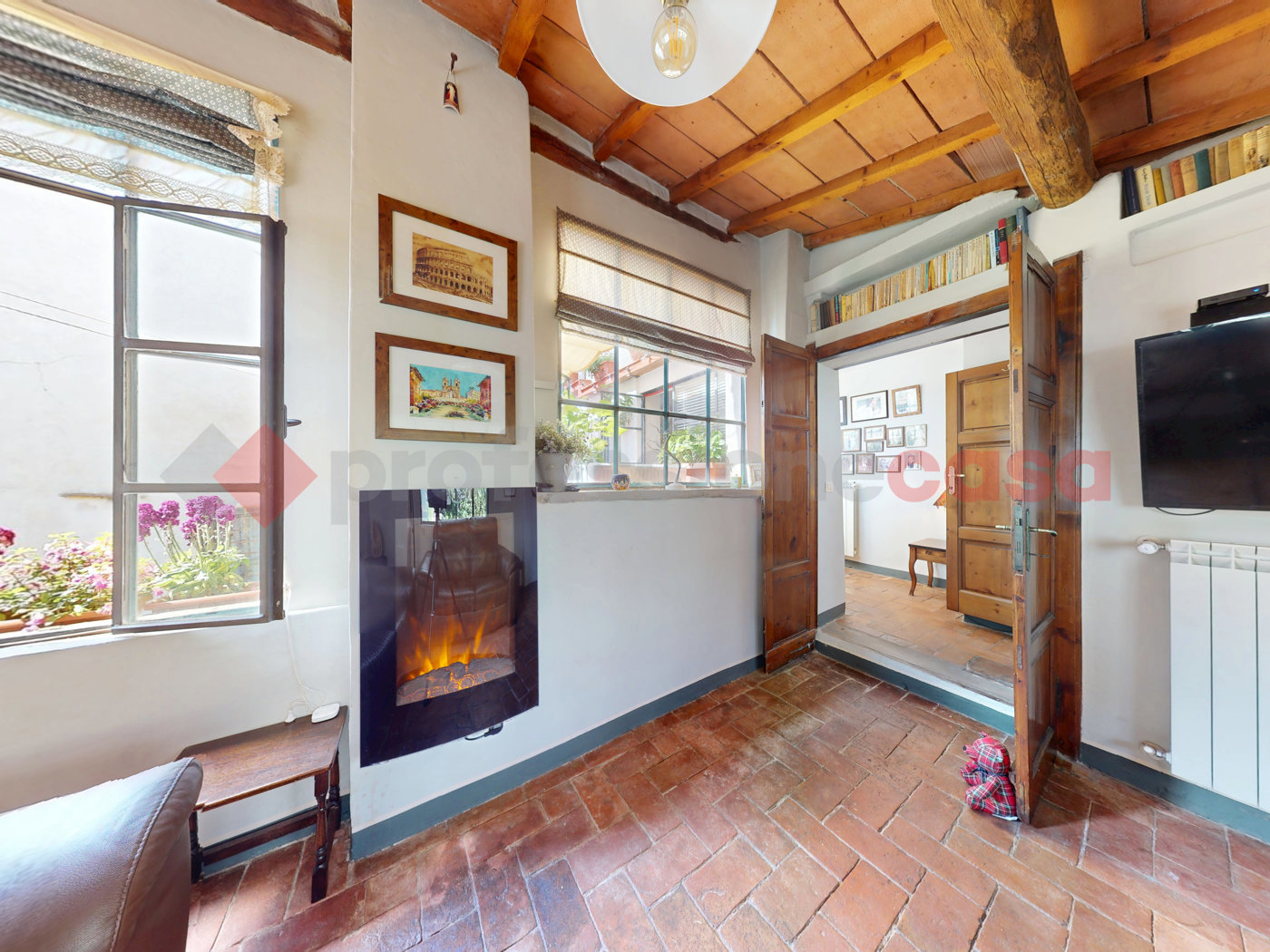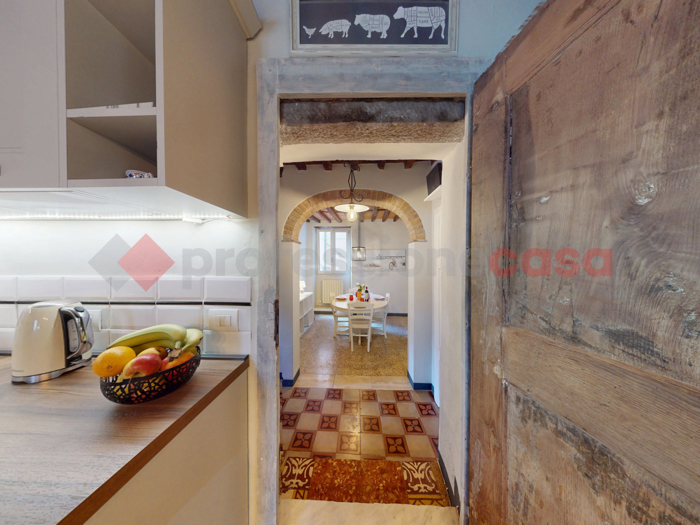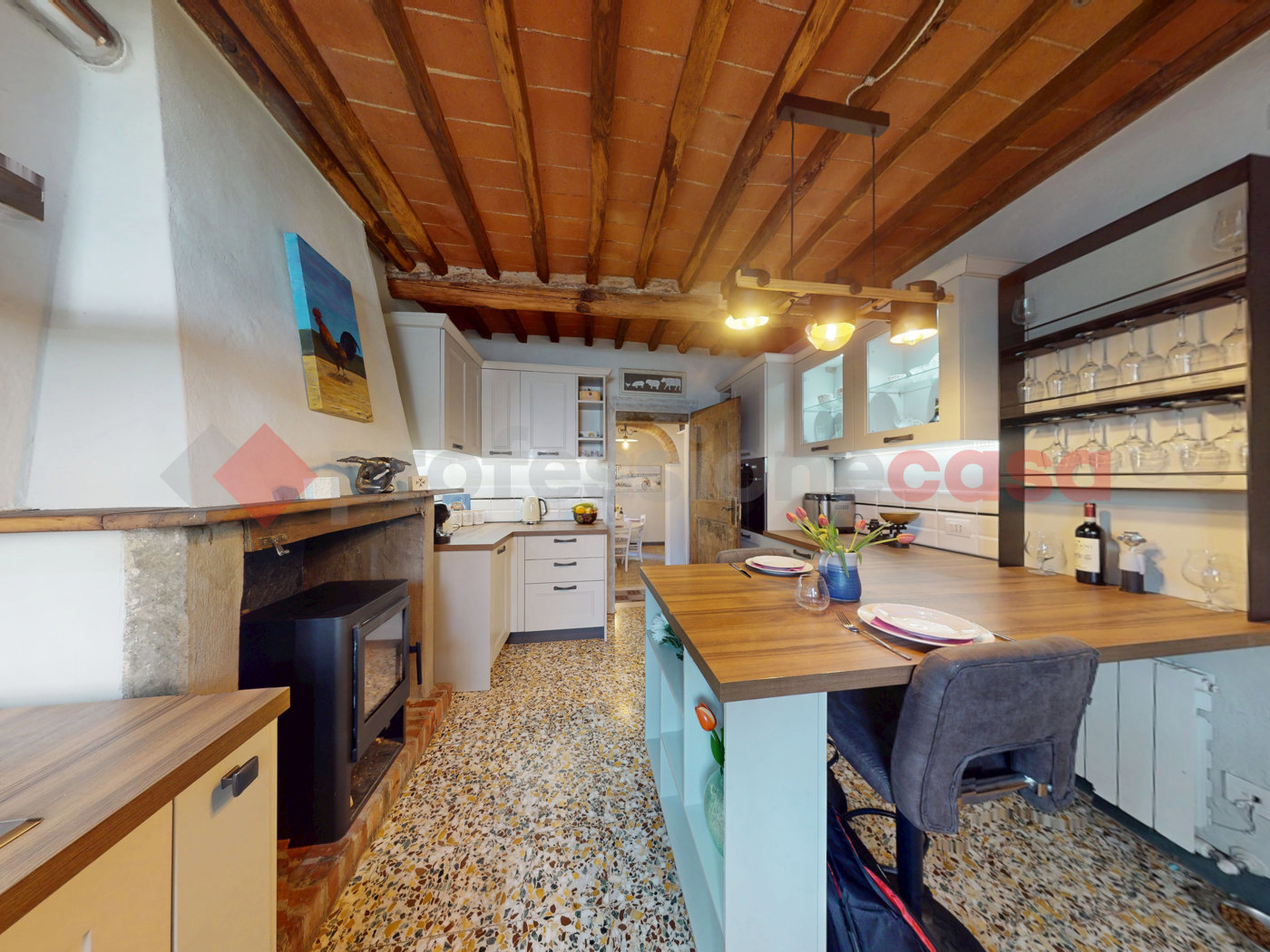 All'interno, troverete dettagli di pregio come le porte in legno massello, i pavimenti originali in graniglia e cotto antico e i suggestivi soffitti con travi a vista.
