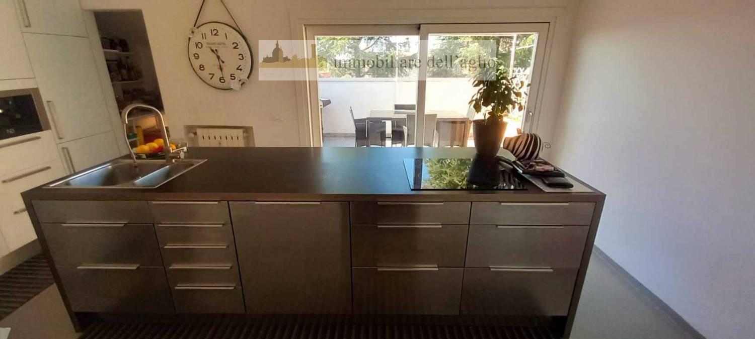 La cucina abitabile, dotata di vetrate che si affacciano su un'ulteriore terrazza, offre l'ambiente ideale per piacevoli cene estive in compagnia di famiglia e amici.