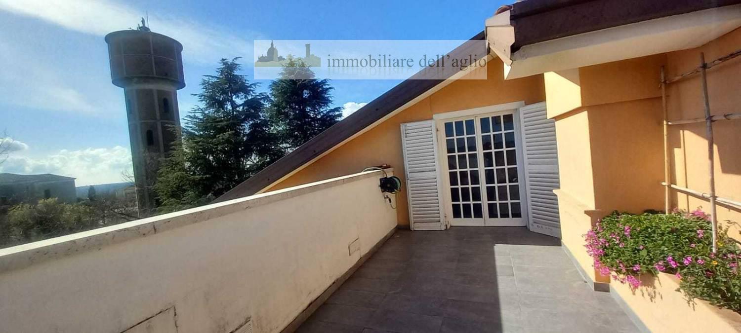 L'immobile si apre con un elegante ingresso e un ampio salone arricchito da una terrazza con vista panoramica mozzafiato.