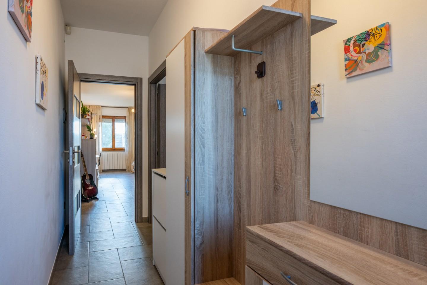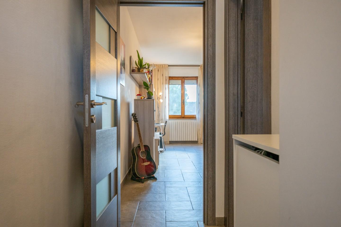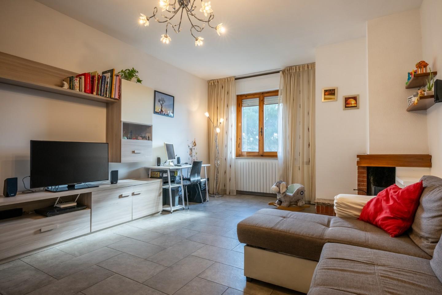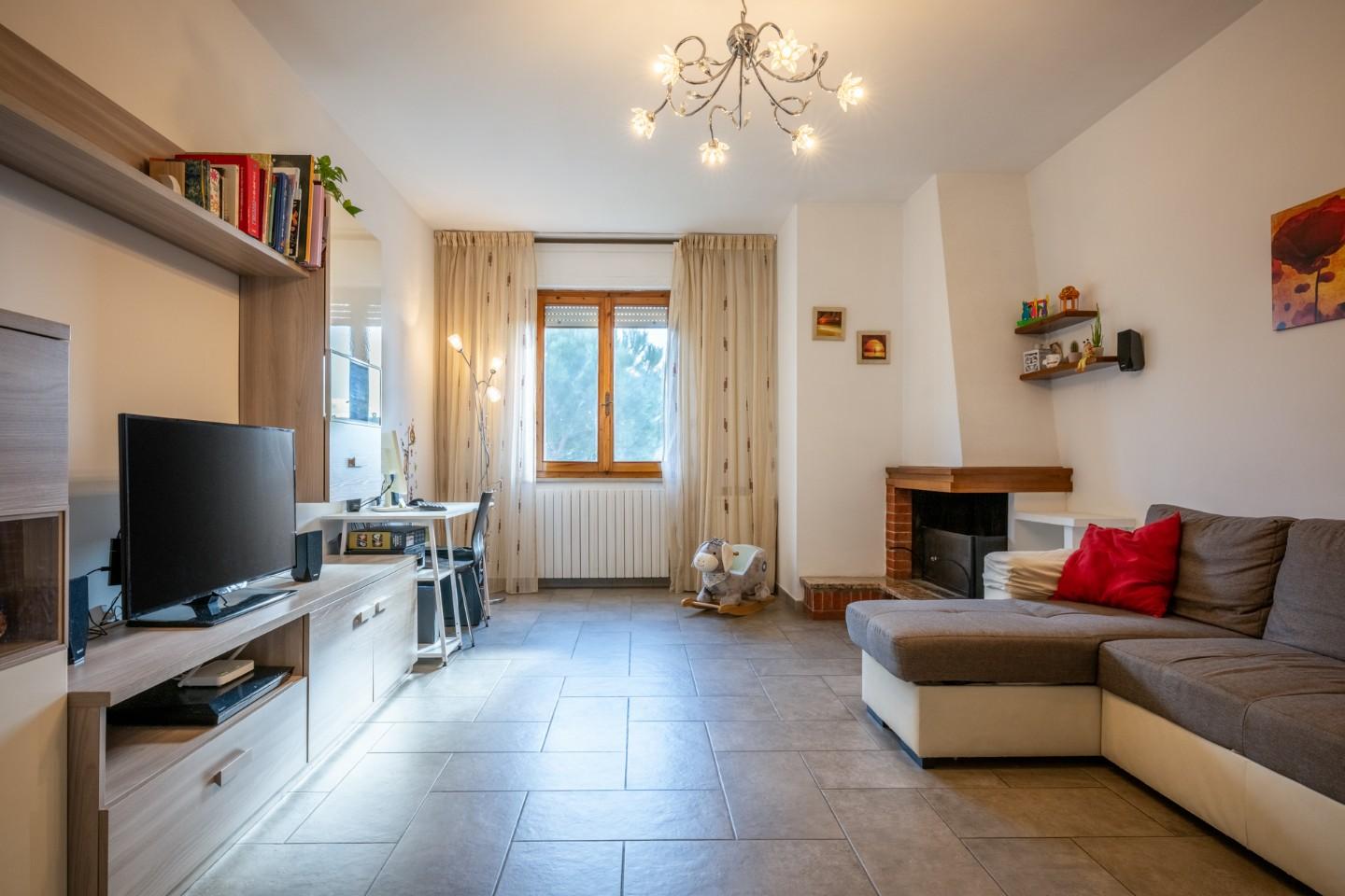 Separato dalla cucina, si trova lampio soggiorno esposto a sud, impreziosito da un camino, vero punto di forza della casa. La zona notte è composta da una camera matrimoniale e una camera singola, entrambe con accesso al balcone, oltre al bagno finestrato con doccia e a un pratico ripostiglio.