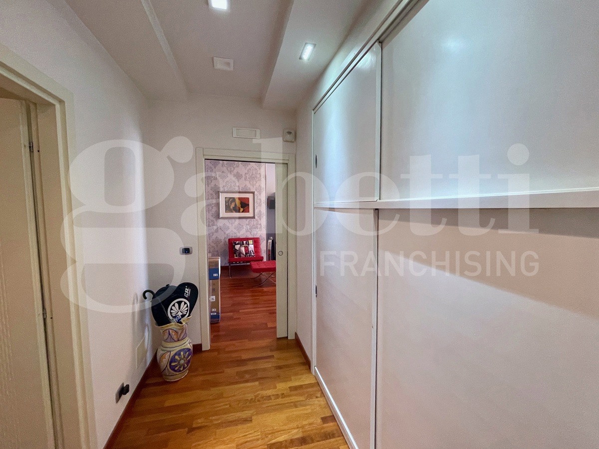 La distribuzione interna offre un ampio salone, una cucina abitabile e una zona notte composta da tre camere da letto, di cui una dotata di cabina armadio, oltre a due bagni: il primo rifinito in marmo, con predisposizione per vasca idromassaggio; il secondo realizzato in pregiato Okite.
