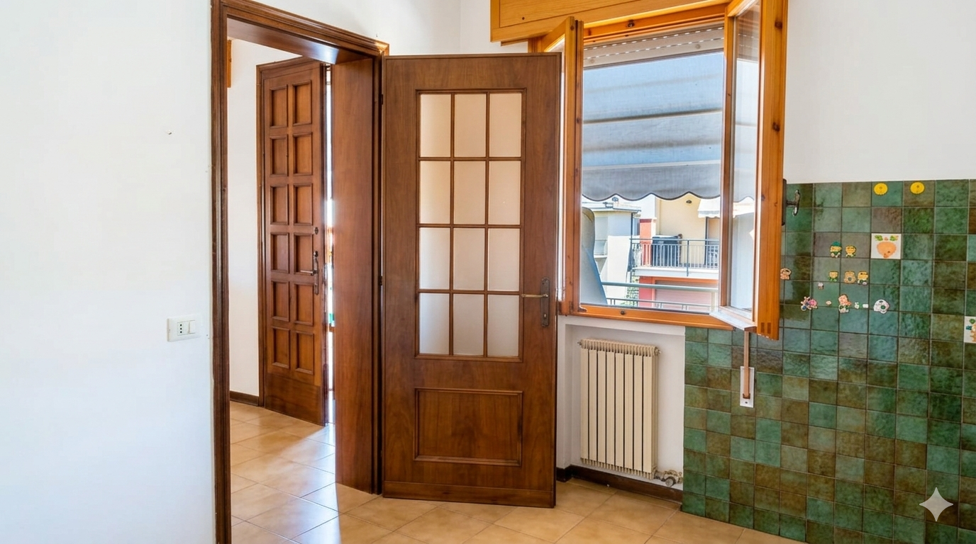Una volta varcata la soglia, veniamo accolti da un soggiorno luminoso che comunica con una spaziosa cucina abitabile.