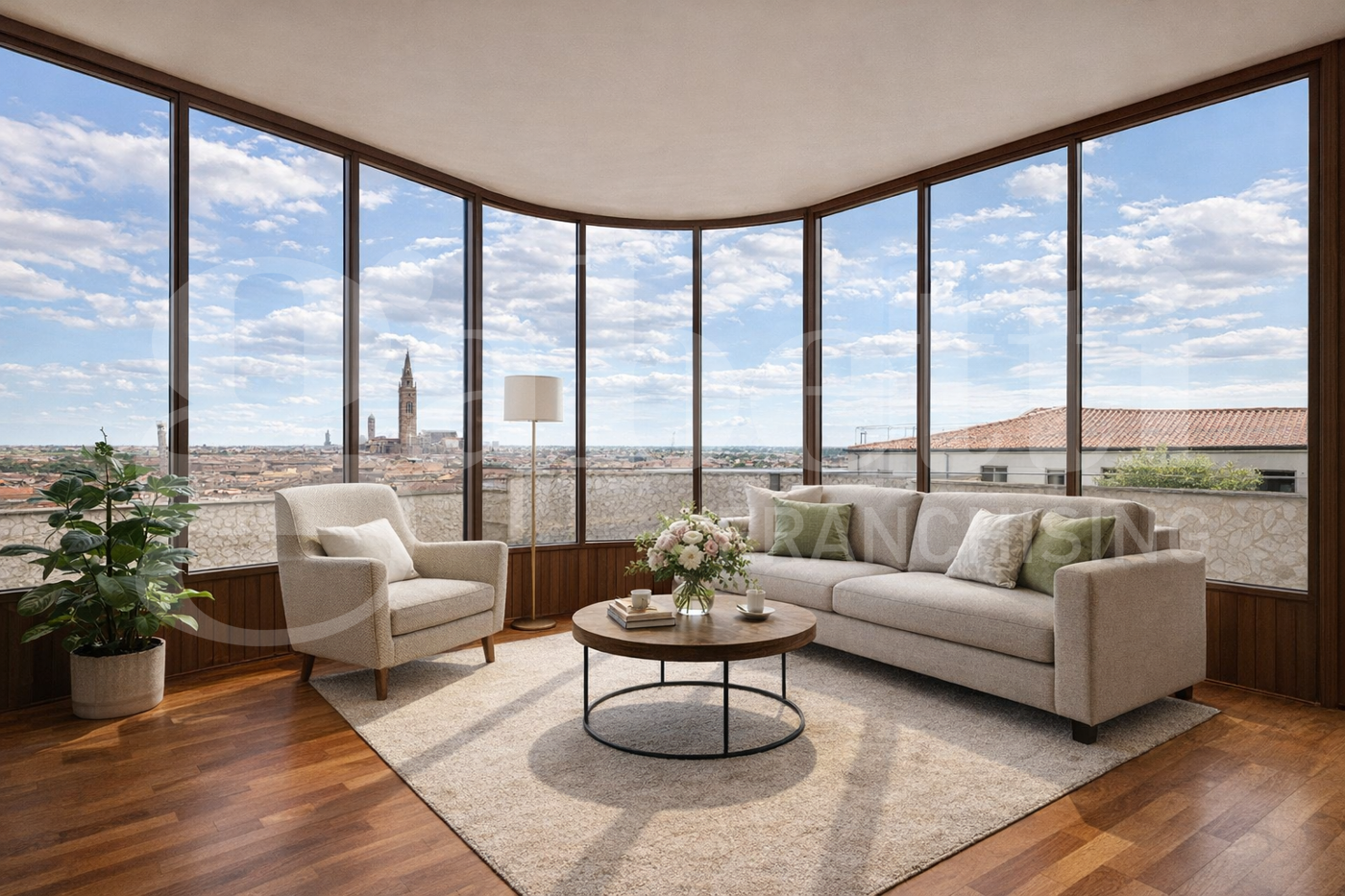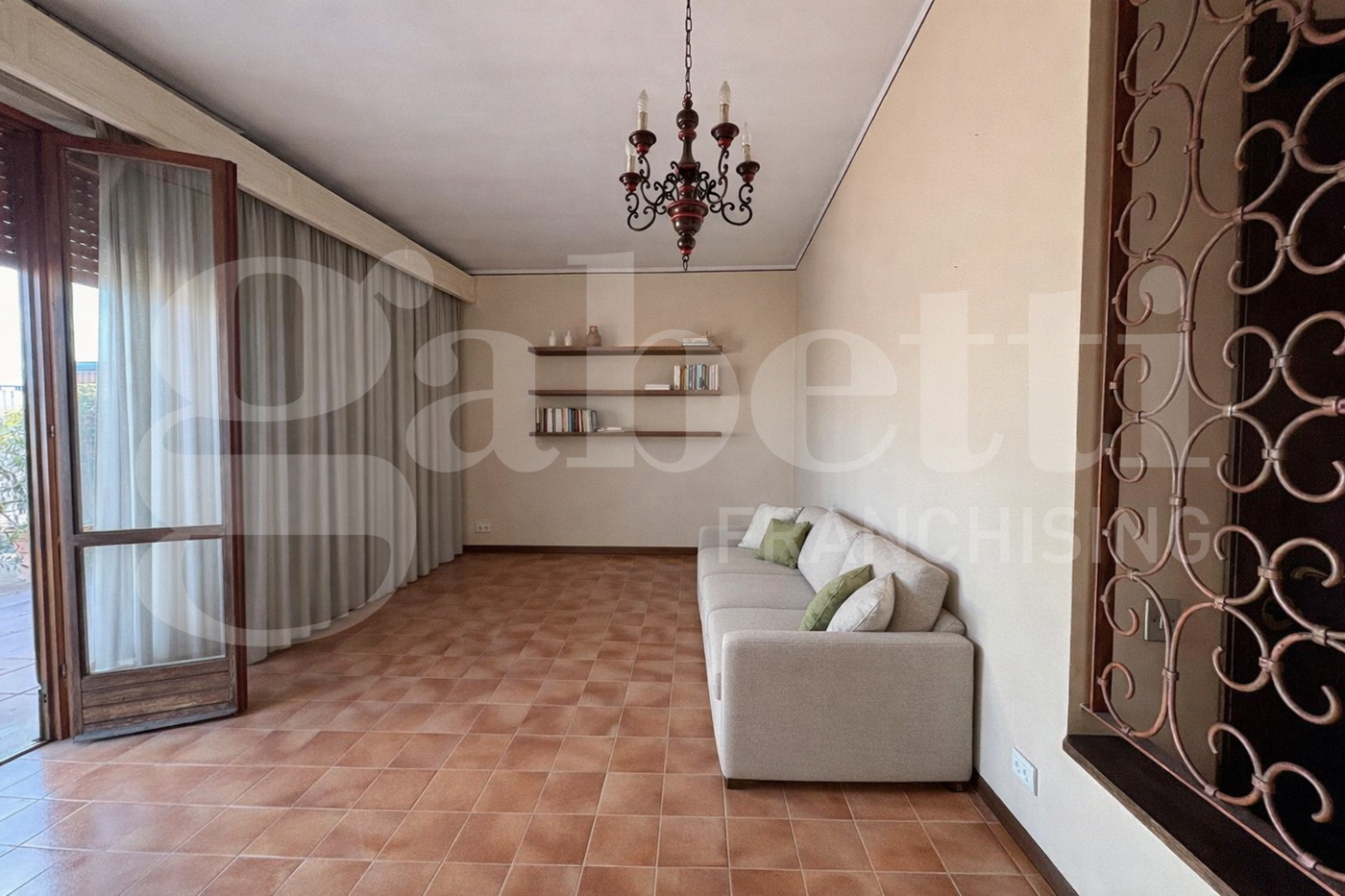 Lingresso si apre su un comodo disimpegno che conduce alla zona giorno, dalla quale si accede a una spettacolare terrazza di 125 mq con vista aperta su tutta la citt e sulle montagne circostanti, ideale per momenti di relax e convivialit.