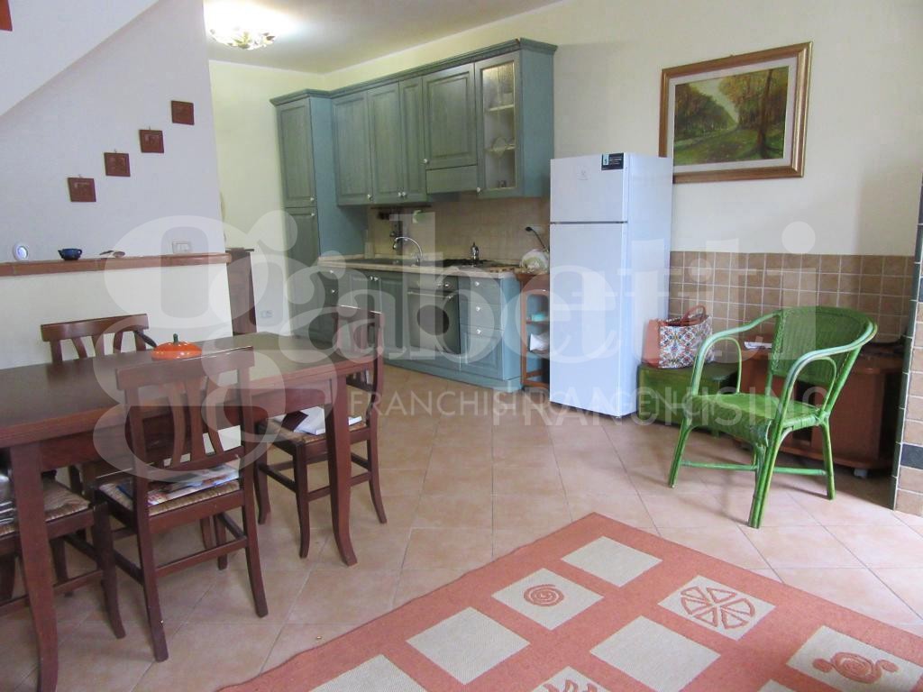 L'appartamento nella zona giorno ha un ampio soggiorno che dispone di un termo-camino, due portefinestre dalle quali si accede ad una terrazza abitabile con vista mare, una parete cottura funzionale e ben progettata ed un bagno.