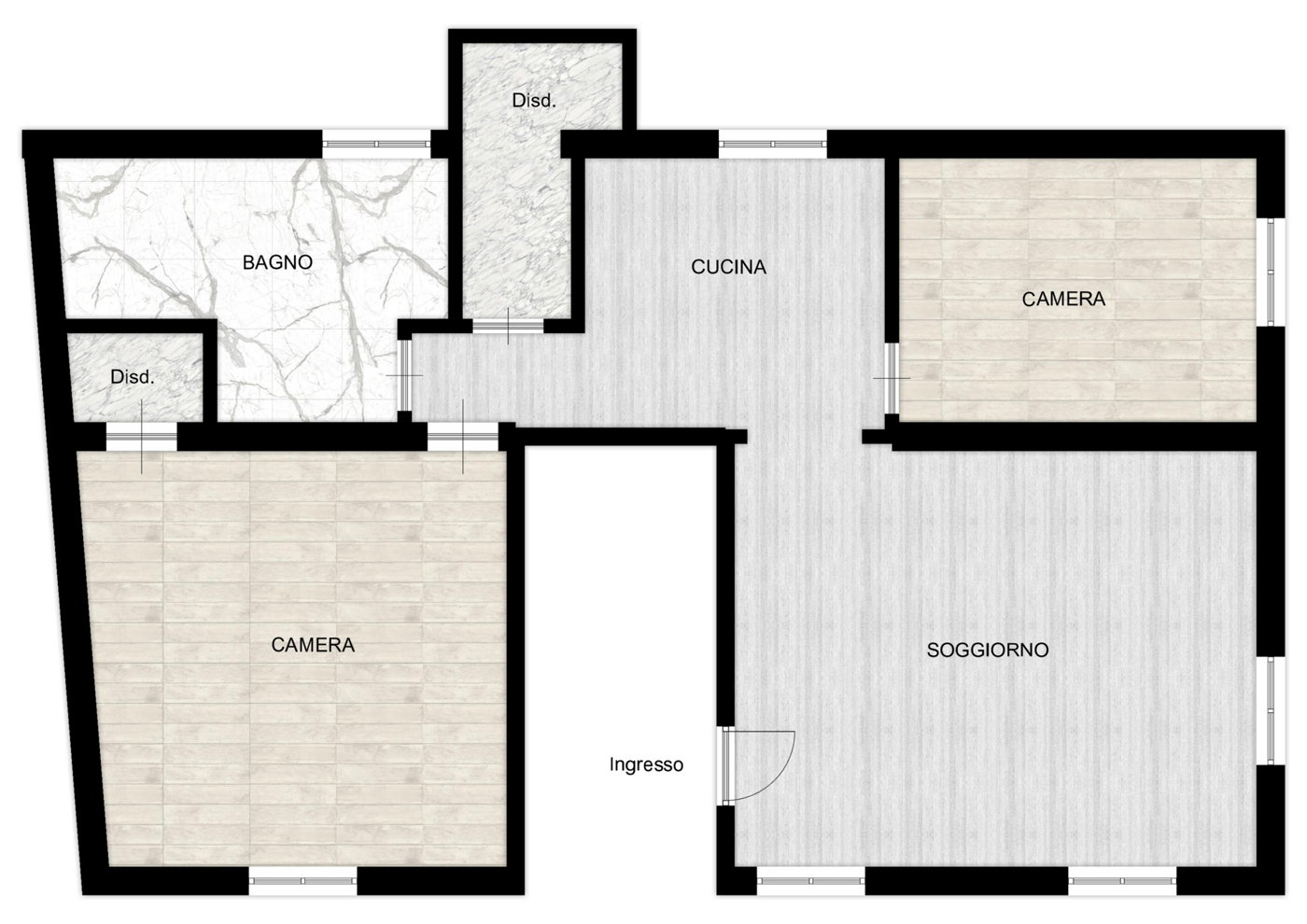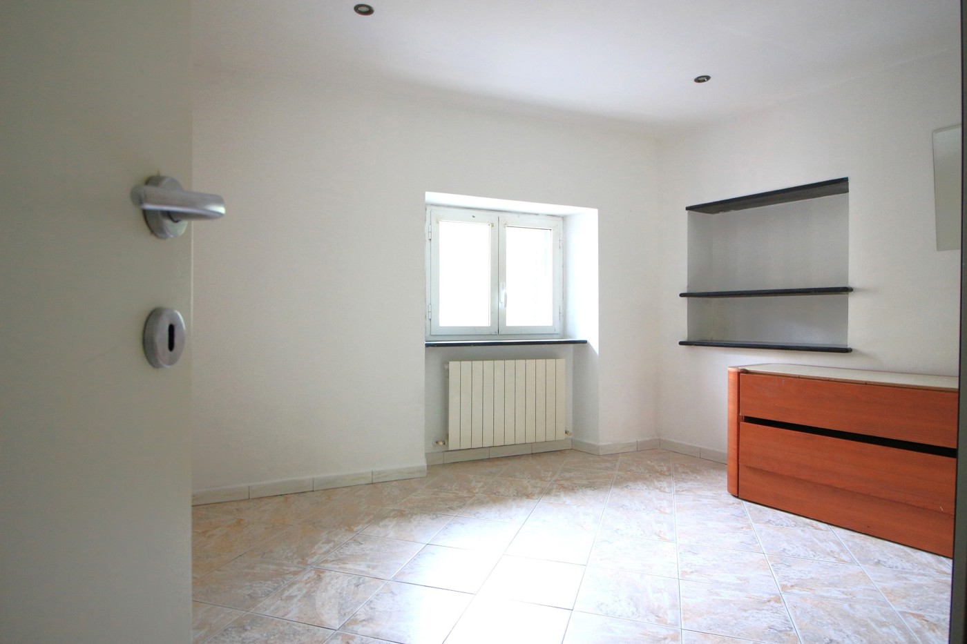 L'immobile composto da: ingresso in sala, 2 camere da letto, cucina, ripostiglio e bagno con doccia e finestra.