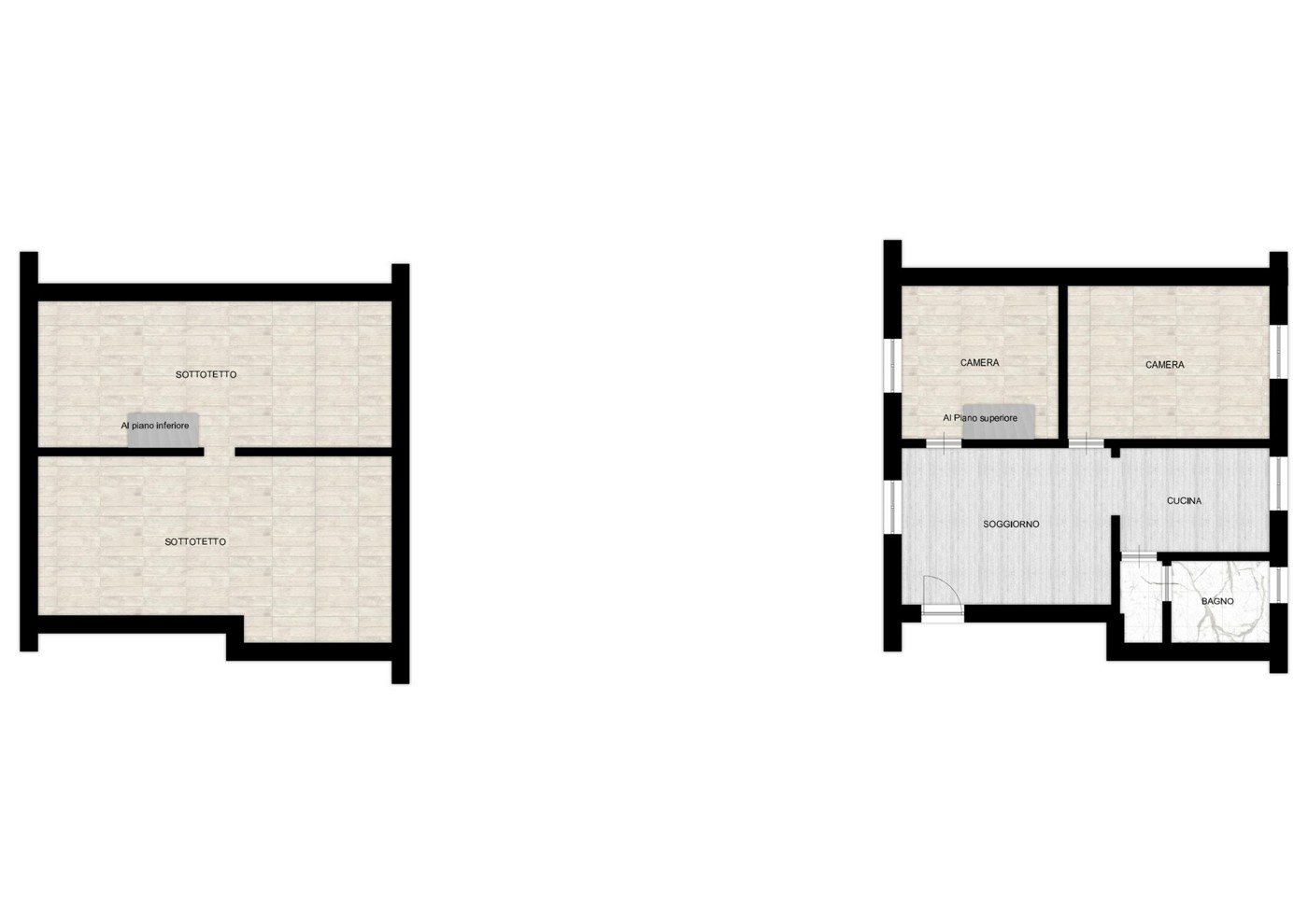 L'immobile composto da: ingresso in sala, 2 camere, cucina abitabile, bagno e una scala interna conduce al sottotetto, attualmente utilizzato come zona notte.