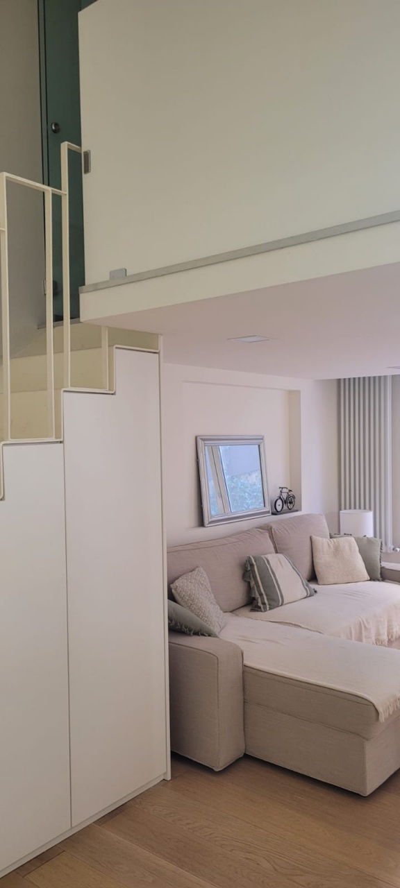 l'appartamento si compone da ingresso affacciato su open space con angolo cottura e soggiorno, nei due soppalchi sono state ricavate due camere da letto con armadi fatti su misura incassati, un bagno con sauna e strepitoso giardino.
