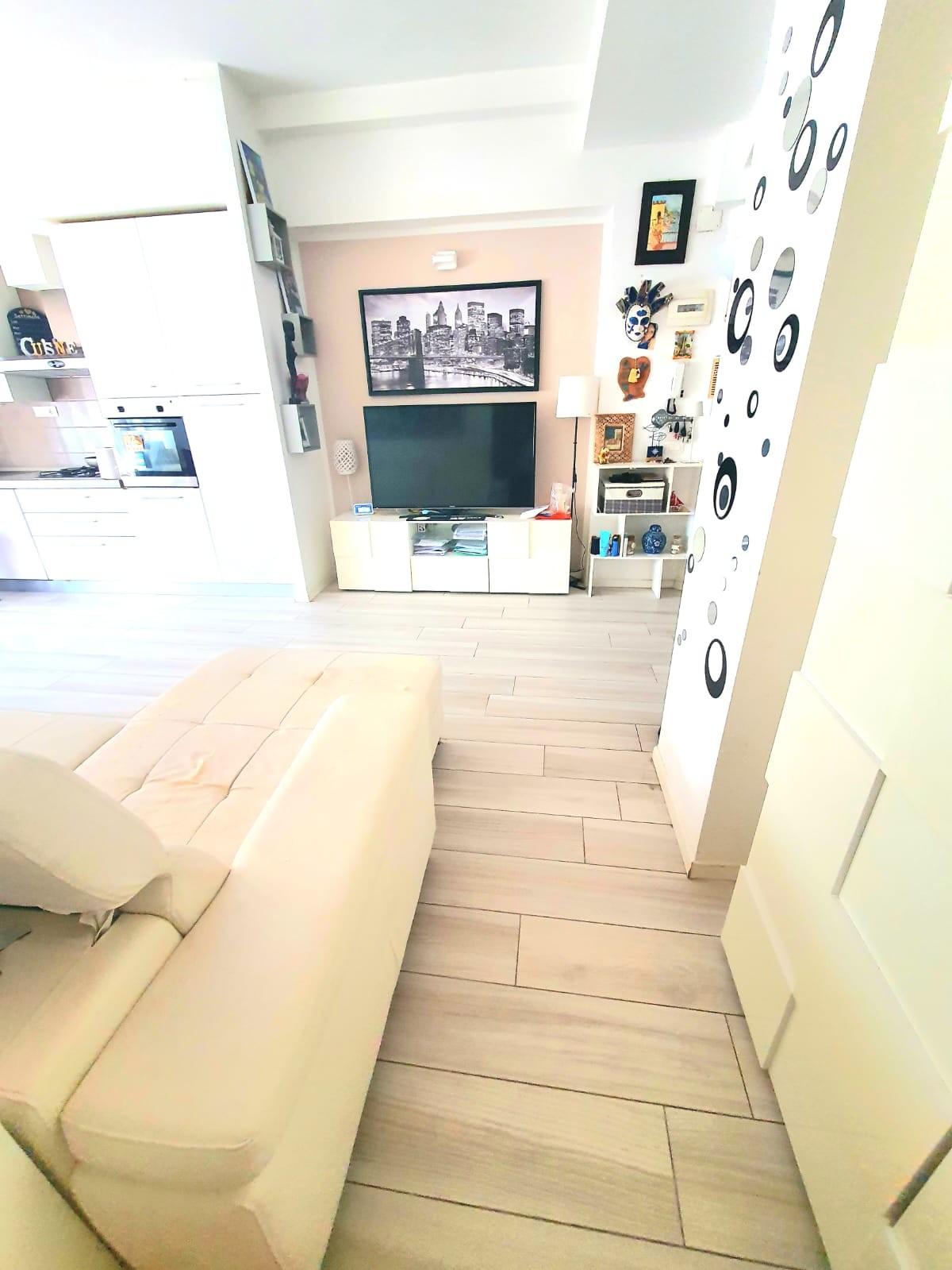 Situato al primo piano di un elegante stabile dotato di ascensore, l'ingresso si apre su un disimpegno che conduce a un ampio soggiorno con angolo cottura in open space, perfetto per vivere momenti di convivialità. La zona notte è ben separata e comprende due camere da letto, di cui una con accesso a un delizioso balcone.