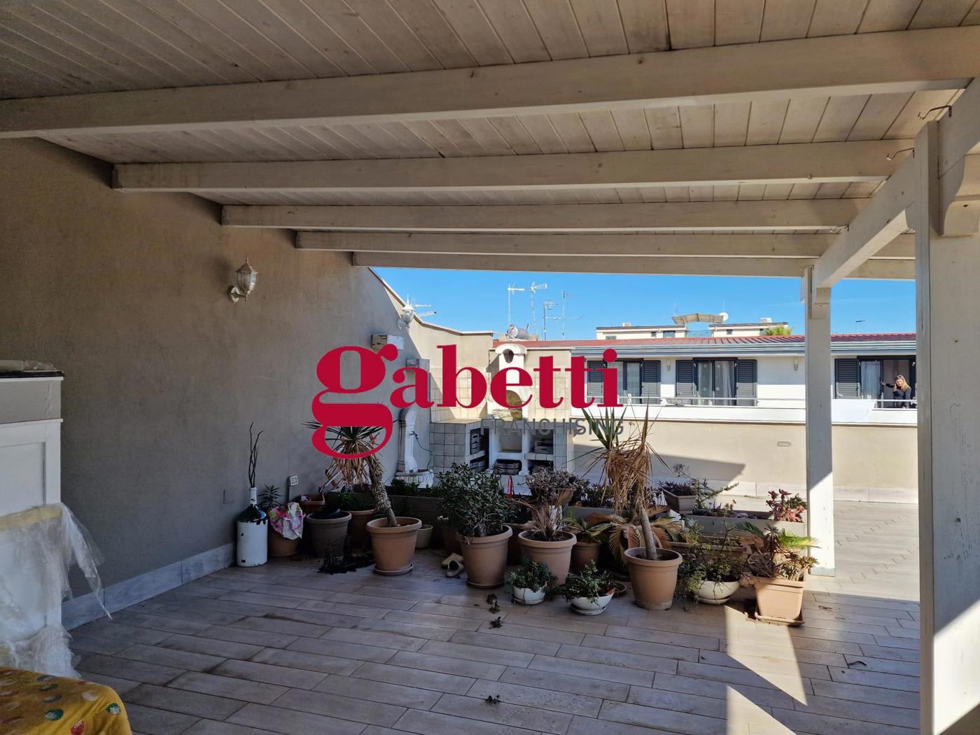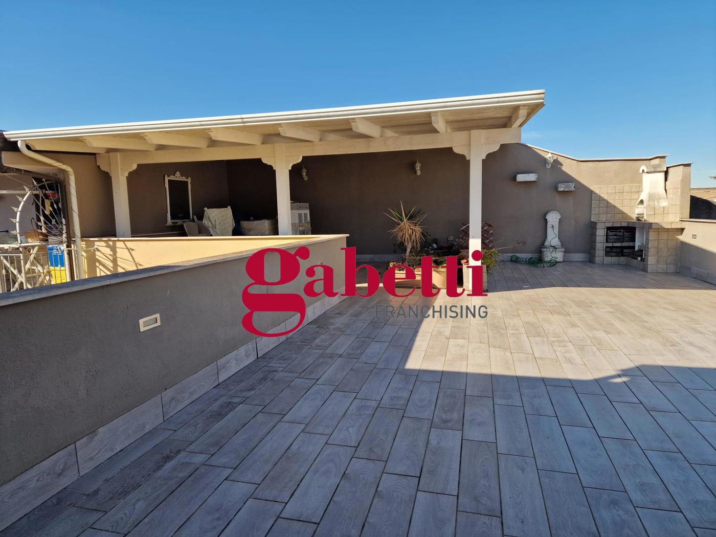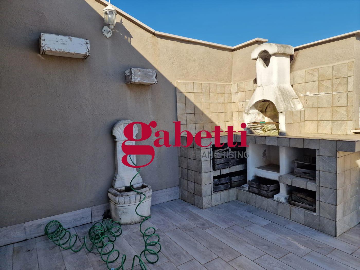 Il terrazzo, perfetto per momenti di relax allaperto o per accogliere ospiti, arricchito da un barbecue in muratura e un pergolato in legno, che creano unatmosfera accogliente e funzionale.