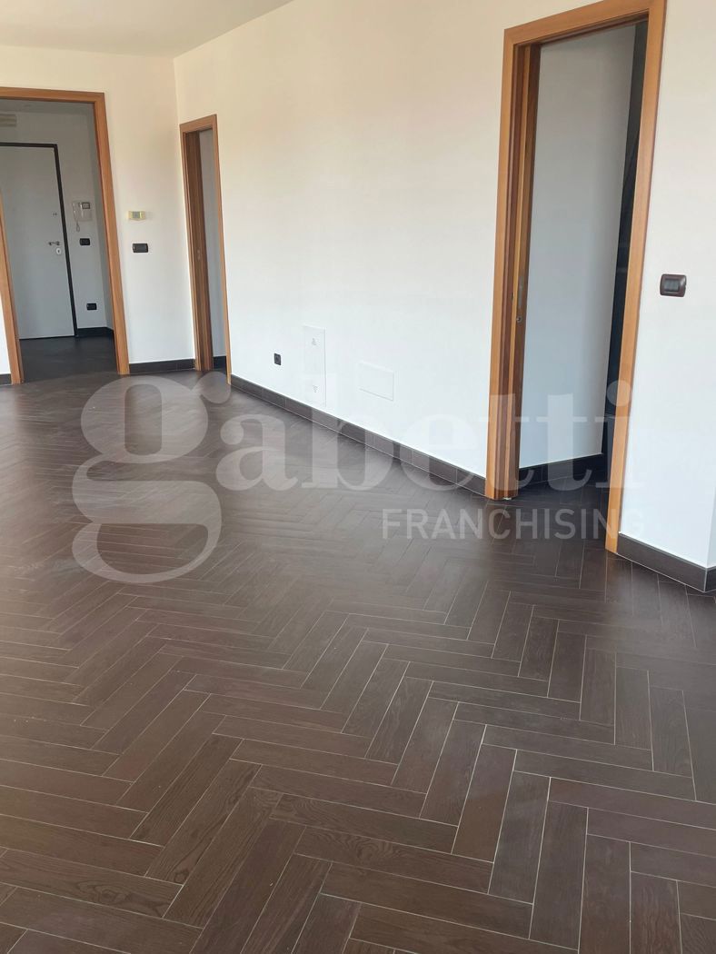 Gli spazi offrono: ingresso, cucina abitabile, ampia zona pranzo con annessa zona salotto con doppio balcone, disimpegno, due bagni e due camere da letto.
