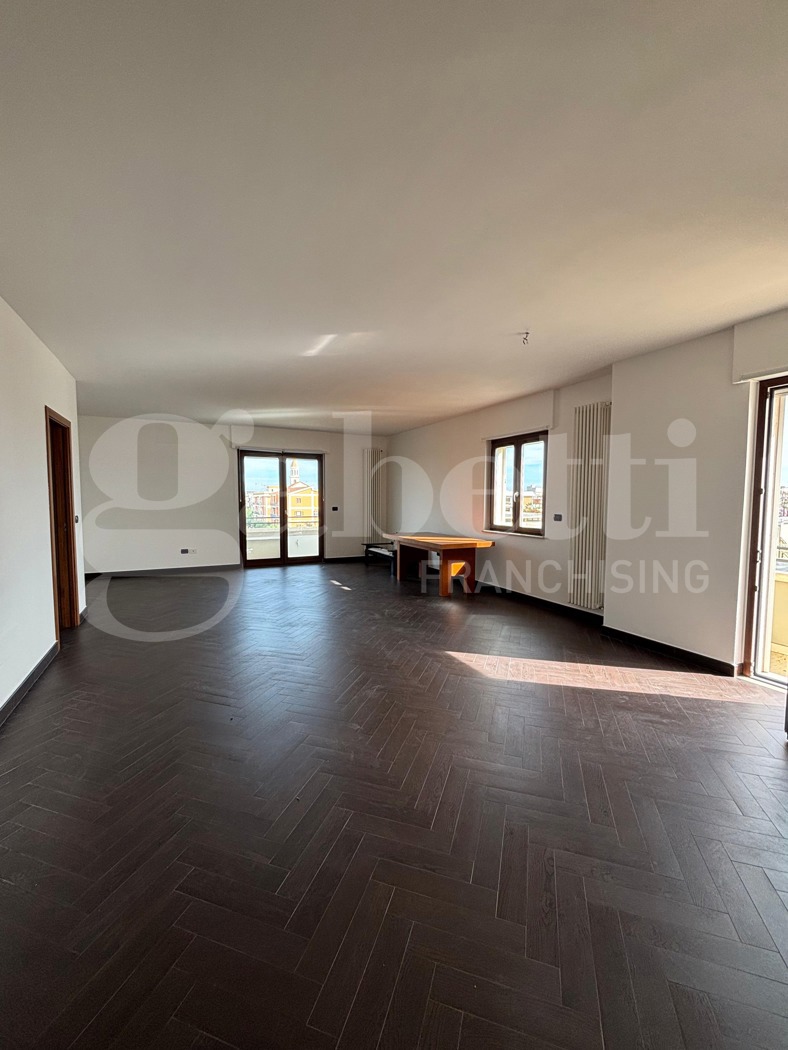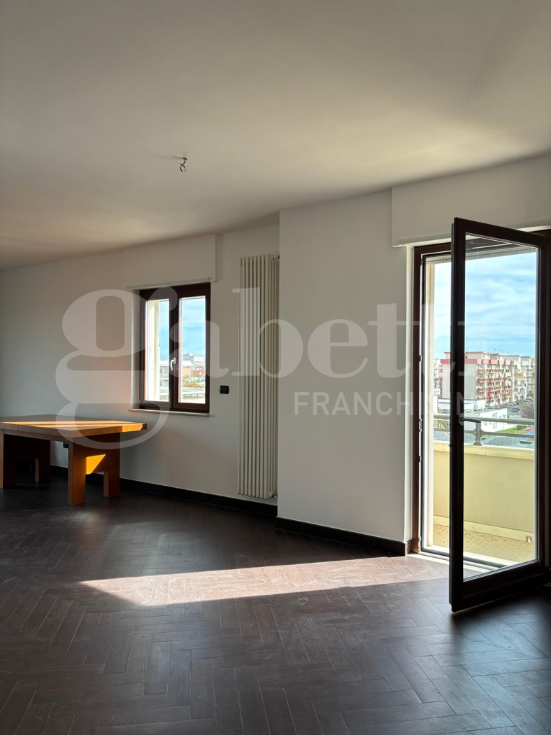 Gli spazi offrono: ingresso, cucina abitabile, ampia zona pranzo con annessa zona salotto con doppio balcone, disimpegno, due bagni e due camere da letto.