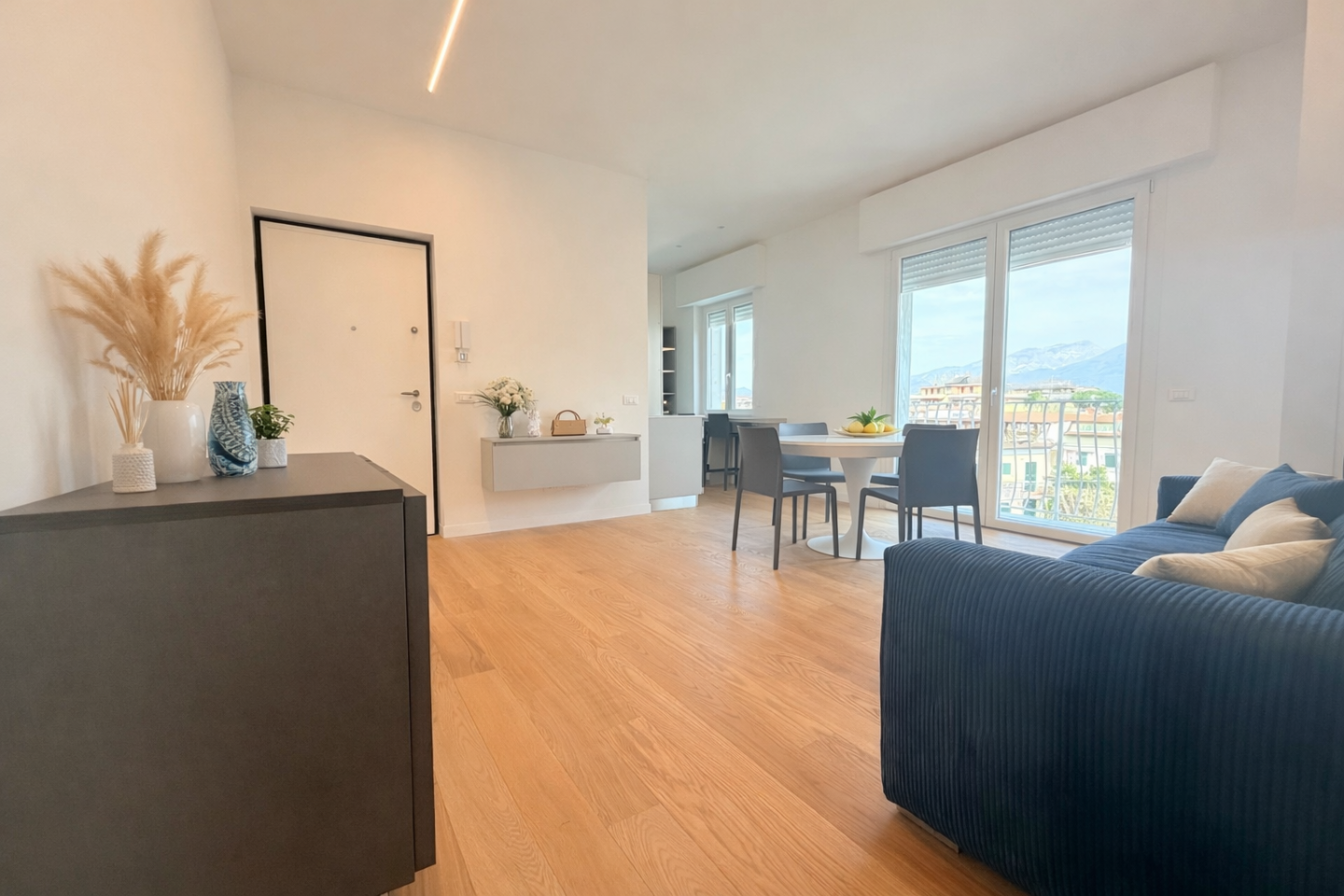 Lingresso si apre direttamente su un ampio soggiorno con angolo cottura, uno spazio accogliente e luminoso che si affaccia su un balcone, ideale per godersi momenti di relax allaria aperta.