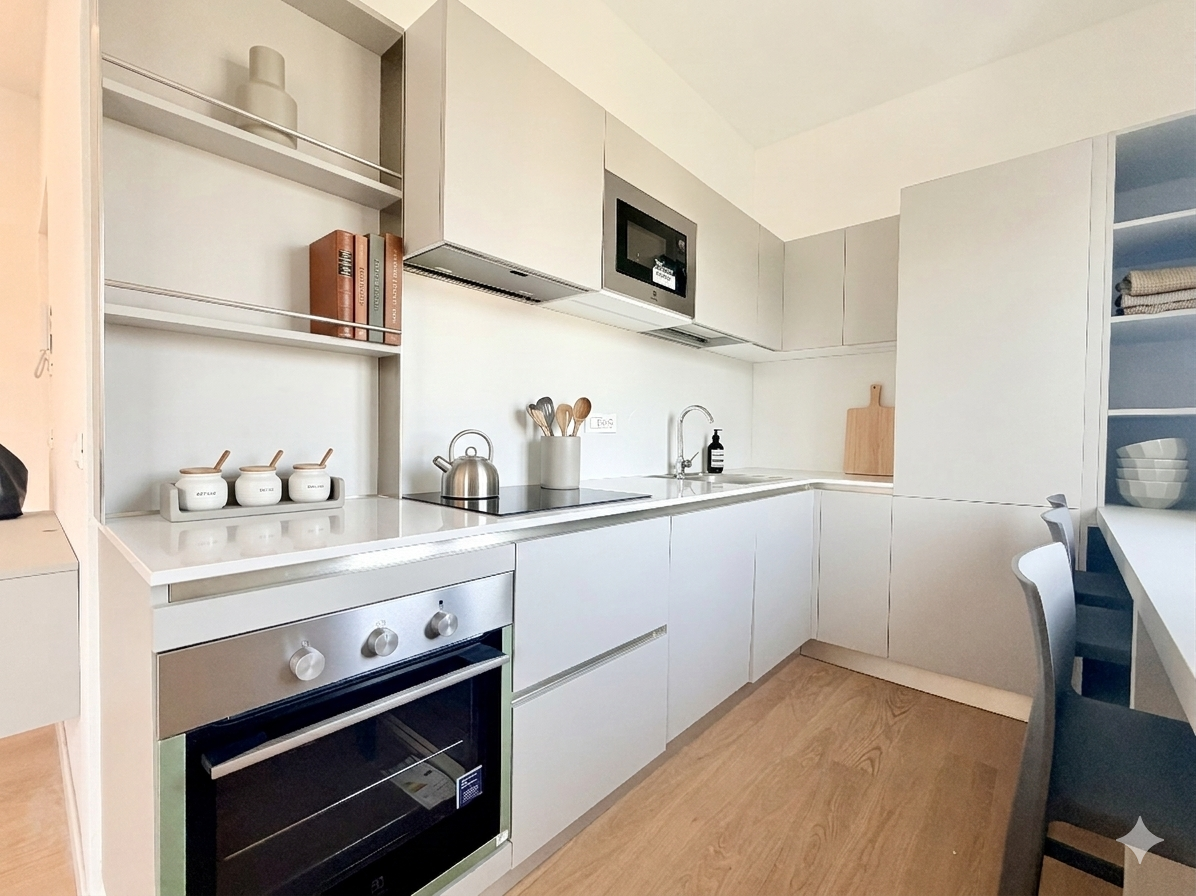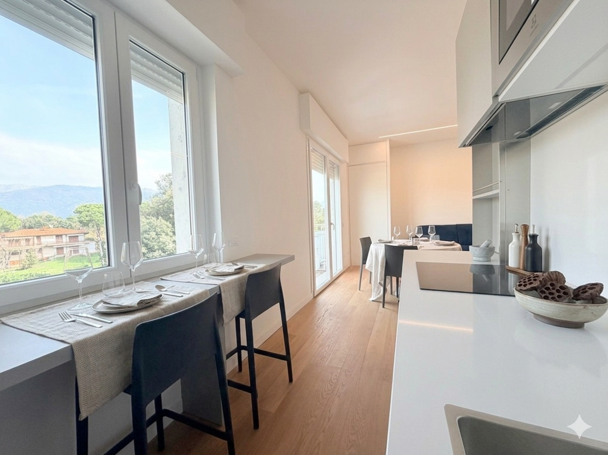 Lingresso si apre direttamente su un ampio soggiorno con angolo cottura, uno spazio accogliente e luminoso che si affaccia su un balcone, ideale per godersi momenti di relax allaria aperta.
