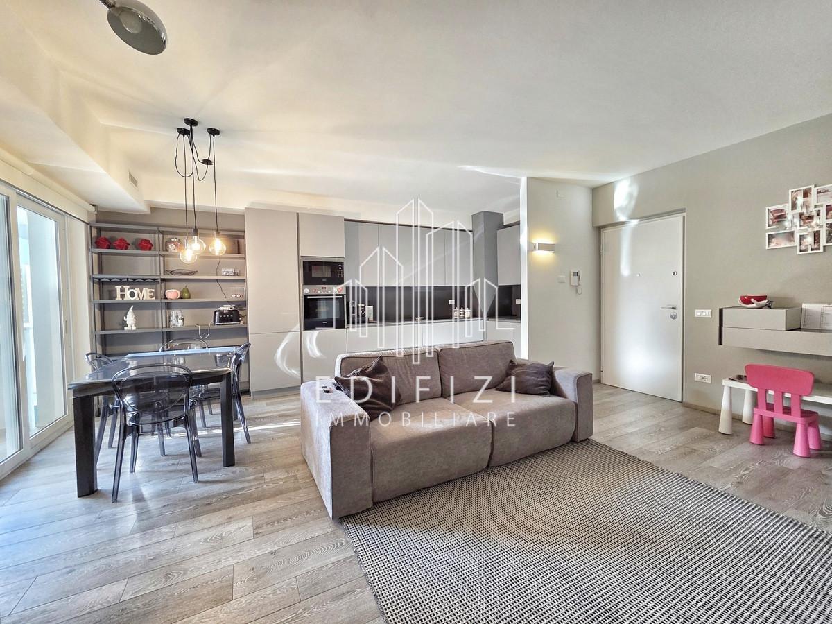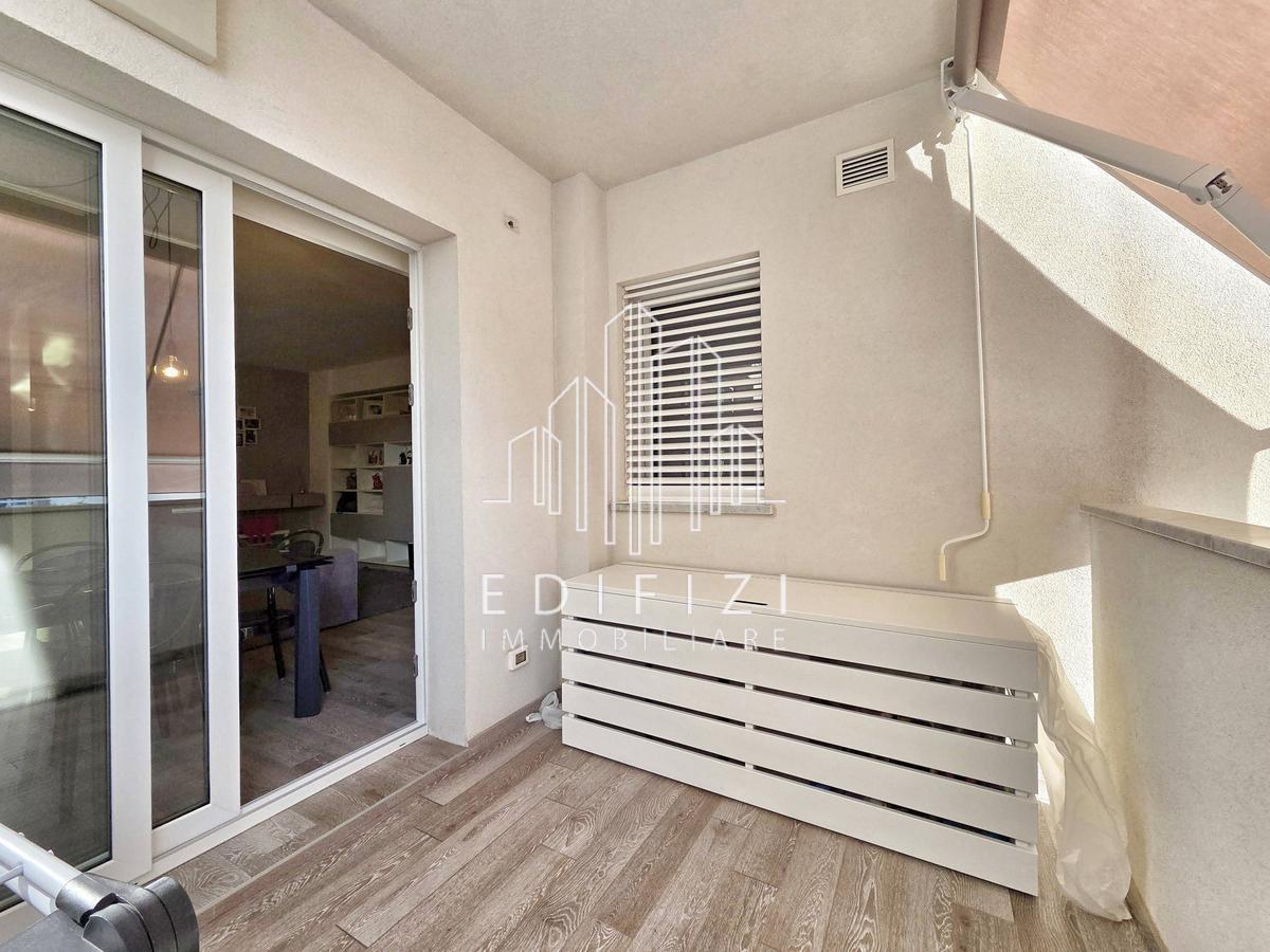 L'appartamento è composto da ampia zona giorno, prospiciente profonda terrazza e con cucina a vista, zona notte con due camere da letto, entrambe servite da ampio balcone, comodo ripostiglio e due bagni, ciascuno con doccia e finestra.