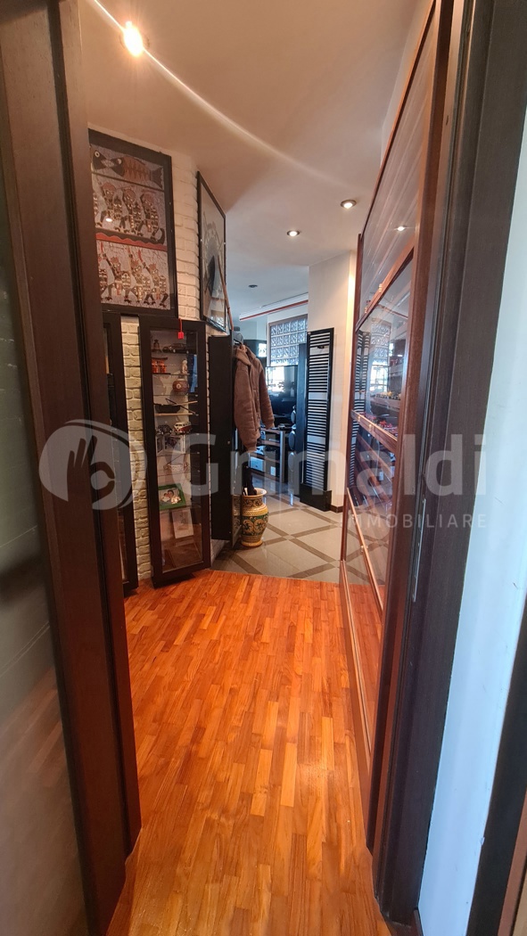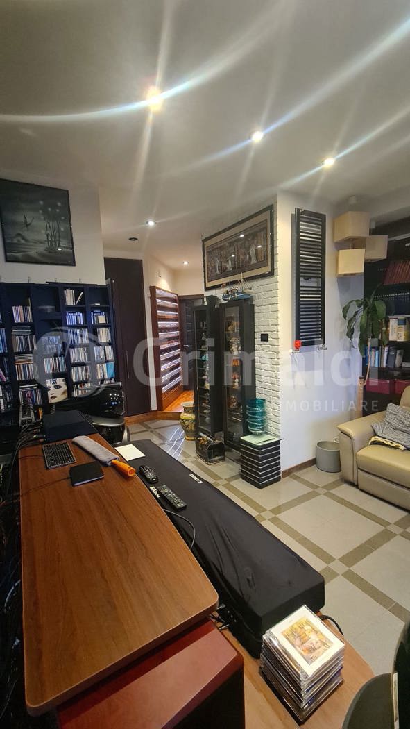 L'ingresso condominiale accoglie gli ospiti in un ambiente curato e ben tenuto, mentre l'appartamento stesso si compone di un ampio salone con cucina a vista, due camere da letto, uno studio con terrazzino privato, due bagni e un pratico ripostiglio.